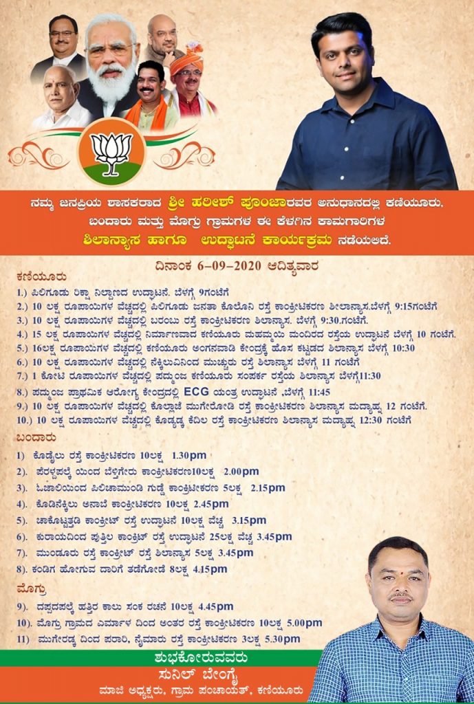 ದಿನಾಂಕ 6-ಸೆಪ್ಟೆಂಬರ್-20 ಆದಿತ್ಯವಾರ ದಂದು ನಮ್ಮ ಜನಪ್ರಿಯ ಶಾಸಕರಾದ ಶ್ರೀ ಹರೀಶ್ ಪೂಂಜಾರವರ ಅನುಧಾನದಲ್ಲಿ ಕಣಿಯೂರು, ಬಂದಾರು ಮತ್ತು ಮೊಗ್ರು ಗ್ರಾಮಗಳ ಈ ಕೆಳಗಿನ ಕಾಮಗಾರಿಗಳ ಶಿಲಾನ್ಯಾಸ ಹಾಗೂ ಉದ್ಘಾಟನೆ ಕಾರ್ಯಕ್ರಮ ನಡೆಯಲಿದೆ.