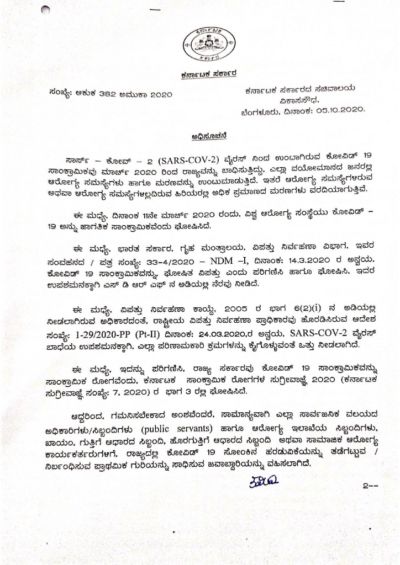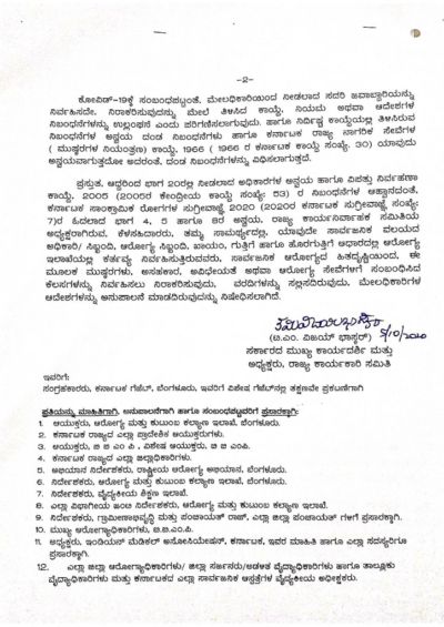 ಪ್ರಸ್ತುತ, ಆದ್ದರಿಂದ ಭಾಗ 20ರಲ್ಲಿ ನೀಡಲಾದ ಅಧಿಕಾರಗಳ ಅನ್ವಯ ಹಾಗೂ ವಿಪತ್ತು ನಿರ್ವಹಣಾ ಕಾಯ್ದೆ, 2005 ( 2005ರ ಕೇಂದ್ರೀಯ ಕಾಯ್ದೆ ಸಂಖ್ಯೆ 53)ರ ನಿಬಂಧನೆಗಳ ಅಹ್ವಾನದಂತೆ ಕರ್ನಾಟಕ ಸಾಂಕ್ರಾಮಿಕ ರೋಗಗಳ ಸುಗ್ರೀವಾಜ್ಞೆ 2020( 2020ರ ಕರ್ನಾಟಕ ಸುಗ್ರೀವಾಜ್ಞೆ ಸಂಖ್ಯೆ 7)ರ ಓದಲಾದ ಭಾಗ 4, 5 ಹಾಗೂ 8ರ ಅನ್ವಯ, ರಾಜ್ಯ ಕಾರ್ಯನಿರ್ವಾಹಕ ಸಮಿತಿಯ ಅಧ್ಯಕ್ಷರಾಗಿರುವ ನಾನು, ತಮ್ಮ ಸಾಮರ್ಥ್ಯದಲ್ಲಿ ಯಾವುದೇ ನೌಕರರು ಸಾರ್ವಜನಿಕ ವಲಯದ ಅಧಿಕಾರಿ, ಸಿಬ್ಬಿಂದಿ, ಆರೋಗ್ಯ ಸಿಬ್ಬಂದಿ, ಖಾಯಂ, ಗುತ್ತಿಗೆ ಹಾಗೂ ಹೊರಗುತ್ತಿಗೆ ಆಧಾರದಲ್ಲಿ ಆರೋಗ್ಯ ಇಲಾಖೆಯಲ್ಲಿ ಕರ್ತವ್ಯ ನಿರ್ವಹಿಸುತ್ತಿರುವವರು, ಸಾರ್ವಜನಿಕ ಆರೋಗ್ಯದ ಹಿತದೃಷ್ಠಿಯಿಂದ ಈ ಮೂಲಕ ಮುಷ್ಕರಗಳು, ಅಸಹಕಾರ, ಅವಿಧೇಯತೆ ಅಥವಾ ಆರೋಗ್ಯ ಸೇವೆಗಳಿಗೆ ಸಂಬಂಧಿಸಿದಂತ ಕೆಲಸಗಳನ್ನು ನಿರ್ವಹಿಸಲು ನಿರಾಕರಿಸುವಂತಿಲ್ಲ. ವರದಿಗಳನ್ನು ಸಲ್ಲಿಸದಿರುವುದು, ಮೇಲಧಿಕಾರಿಗಳ ಆದೇಶಗಳನ್ನು ಅನುಪಾಲನೆ ಮಾಡದಿರುವುದನ್ನು ನಿಷೇಧಿಸಲಾಗಿದೆ ಎಂಬುದಾಗಿ ರಾಜ್ಯ ಸರ್ಕಾರ ಆದೇಶಿಸಿದ್ದಾರೆ. ಈ ಮೂಲಕ ರಾಜ್ಯದ ಯಾವುದೇ ಸಾರ್ವಜನಿಕ ವಲಯದ ಅಧಿಕಾರಿ, ಸಿಬ್ಬಂದಿಗಳು ಮುಷ್ಕರ ನಡೆಸದಂತೆ ಖಡಕ್ ಸೂಚನೆಯನ್ನು ನೀಡಿದ್ದಾರೆ.