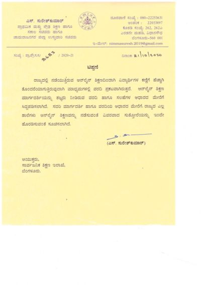 ಈ ಕುರಿತಂತೆ ಸಾರ್ವಜನಿಕ ಶಿಕ್ಷಣ ಇಲಾಖೆಯ ಆಯುಕ್ತರಿಗೆ ಪತ್ರ ಬರೆದಿರುವ ಪ್ರಾಥಮಿಕ ಮತ್ತು ಪ್ರೌಢ ಶಿಕ್ಷಣ ಸಚಿವ ಎಸ್ ಸುರೇಶ್ ಕುಮಾರ್, ರಾಜ್ಯದಲ್ಲಿ ನಡೆಯುತ್ತಿರುವ ಆನ್ ಲೈನ್ ಶಿಕ್ಷಣದಿಂದಾಗಿ ವಿದ್ಯಾರ್ಥಿಗಳ ಕಣ್ಣಿಗೆ ಹೆಚ್ಚಾಗಿ ತೊಂದರೆಯಾಗುತ್ತಿರುವುದಾಗಿ ಮಾಧ್ಯಮಗಳಲ್ಲಿ ವರದಿ ಪ್ರಕಟವಾಗಿರುತ್ತದೆ.