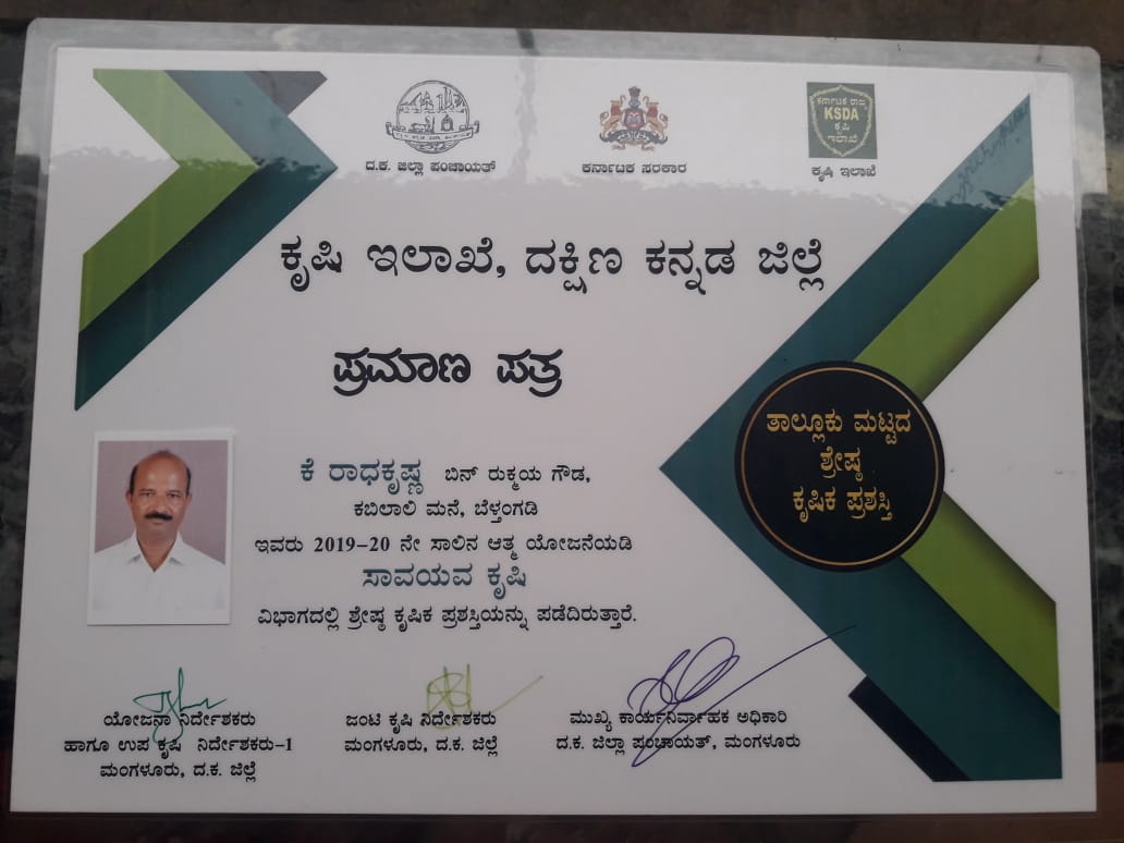 ಬೆಳ್ತಂಗಡಿ: 2019-20 ನೇ ಸಾಲಿನ ಆತ್ಮ ಯೋಜನೆ ಯಡಿ ಸಾವಯವ ಕೃಷಿ ವಿಭಾಗದಲ್ಲಿ ತಾಲೂಕು ಮಟ್ಟದ ಶ್ರೇಷ್ಠ ಕೃಷಿ ಪ್ರಶಸ್ತಿಯನ್ನು ರಾಧಾ ಕೃಷ್ಣ ಗೌಡ ತಮ್ಮ ಮುಡಿಗೇರಿಸಿಕೊಂಡಿದ್ದಾರೆ.