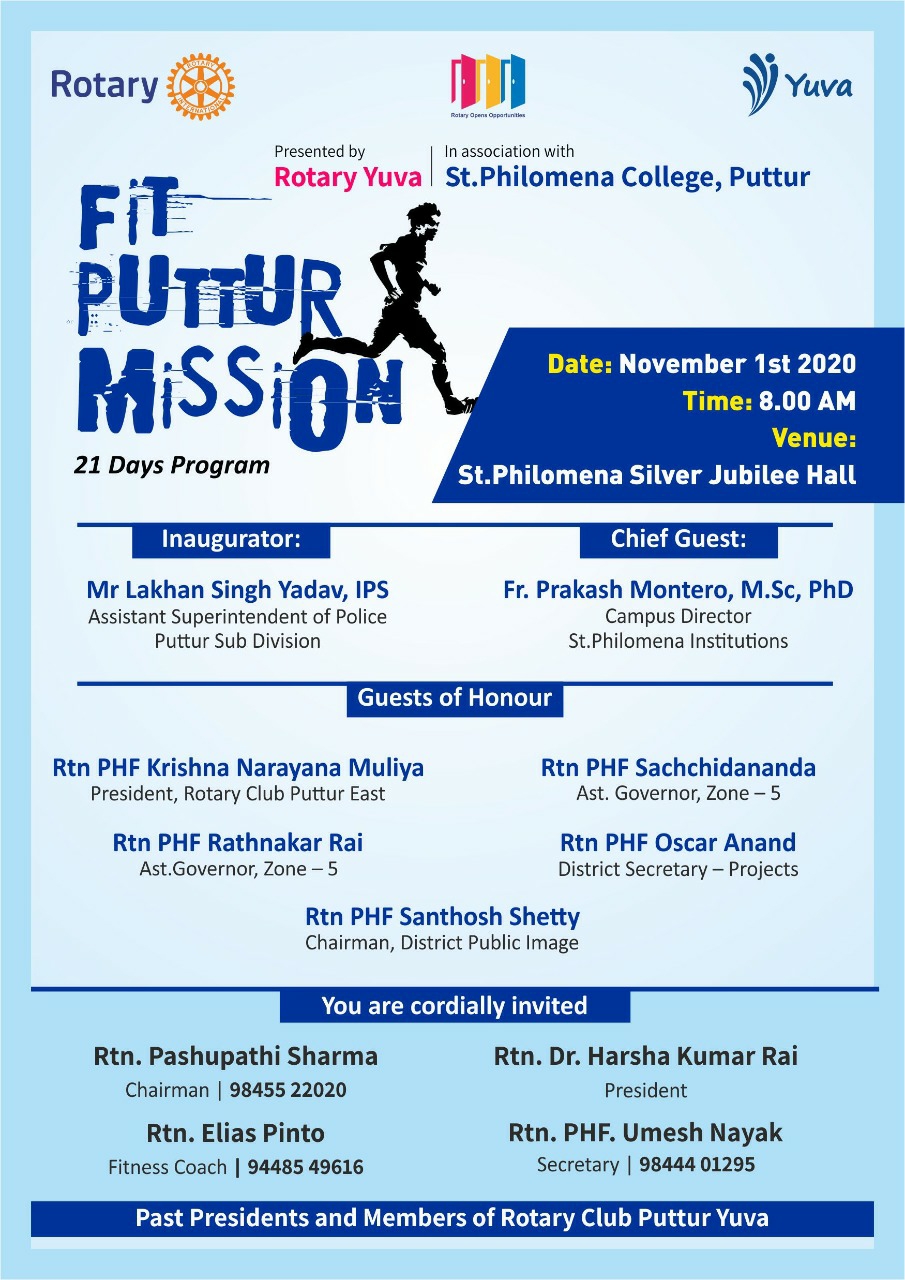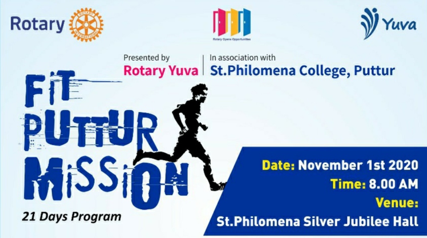ಪುತ್ತೂರು: ಭಾರತದಾದ್ಯಂತ ನಡೆಯುತ್ತಿರುವ “ಫಿಟ್ ಇಂಡಿಯಾ” ಕಾರ್ಯಕ್ರಮದ ಅಂಗವಾಗಿ ರೋಟರಿ ಕ್ಲಬ್ ಪುತ್ತೂರು ಯುವದ ವತಿಯಿಂದ ಸಂತ ಫಿಲೋಮಿನಾ ಕಾಲೇಜಿನ ಸಹಯೋಗದೊಂದಿಗೆ 21 ದಿನಗಳ ರೋಟರಿ ಮಿಷನ್ ಫಿಟ್ ಪುತ್ತೂರು ಕಾರ್ಯಕ್ರಮವನ್ನು ನ 1 ರಿಂದ 21 ದಿನಗಳವರೆಗೆ ಹಮ್ಮಿಕೊಳ್ಳಲಾಗಿದೆ ಎಂದು ಕಾರ್ಯಕ್ರಮದ ಚೇರ್ ಮೆನ್ ಪಶುಪತಿ ಶರ್ಮ ಪತ್ರಿಕಾಗೋಷ್ಠಿಯಲ್ಲಿ ಹೇಳಿದ್ದಾರೆ.