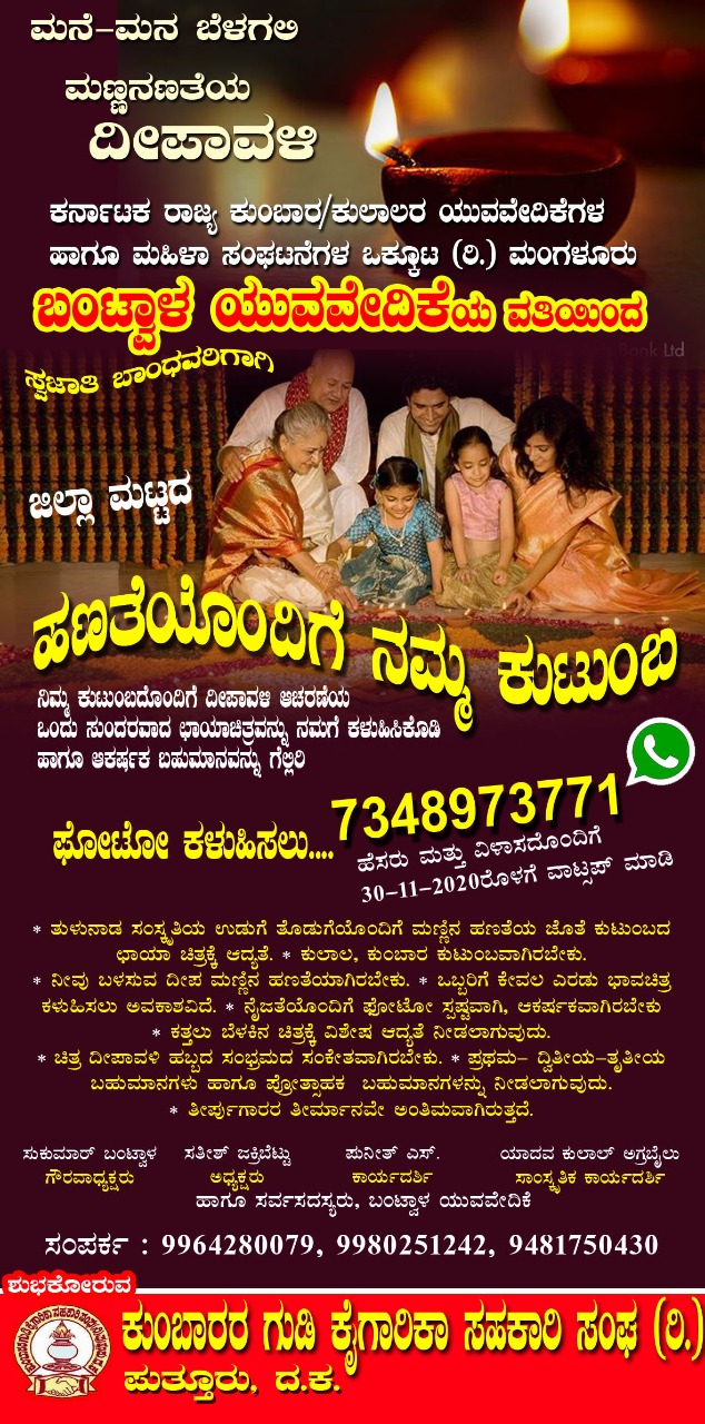 ಬಂಟ್ವಾಳ: ಕರ್ನಾಟಕ ರಾಜ್ಯ ಕುಂಬಾರ/ ಕುಲಾಲರ ಯುವವೇದಿಕೆಗಳ ಹಾಗೂ ಮಹಿಳಾ ಸಂಘಟನೆಗಳ ಒಕ್ಕೂಟ (ರಿ.) ಮಂಗಳೂರು, ಬಂಟ್ವಾಳ ಯುವವೇದಿಕೆಯ ವತಿಯಿಂದ ಸ್ವಜಾತಿ ಬಾಂಧವರಿಗೆ ಜಿಲ್ಲಾ ಮಟ್ಟದ ’ಹಣತೆಯೊಂದಿಗೆ ನಮ್ಮ ಕುಟುಂಬ’ ಎಂಬ ಫೋಟೋ ಸ್ಪರ್ಧೆ ನಡೆಯಲಿದೆ. ಸ್ಪರ್ಧೆಗೆ ನಿಮ್ಮ ಕುಟುಂಬದೊಂದಿಗೆ ದೀಪಾವಳಿ ಆಚರಣೆಯ ಒಂದು ಸುಂದರ ಛಾಯಾಚಿತ್ರ, ಹೆಸರು ಹಾಗೂ ವಿಳಾಸದೊಂದಿಗೆ ದಿನಾಂಕ 30-11-2020 ರೊಳಗೆ 7348973771 ವಾಟ್ಸಪ್ ನಂಬರ್ಗೆ ಕಳುಹಿಸಿ, ಆಕರ್ಷಕ ಬಹುಮಾನ ಗೆಲ್ಲಿ.
