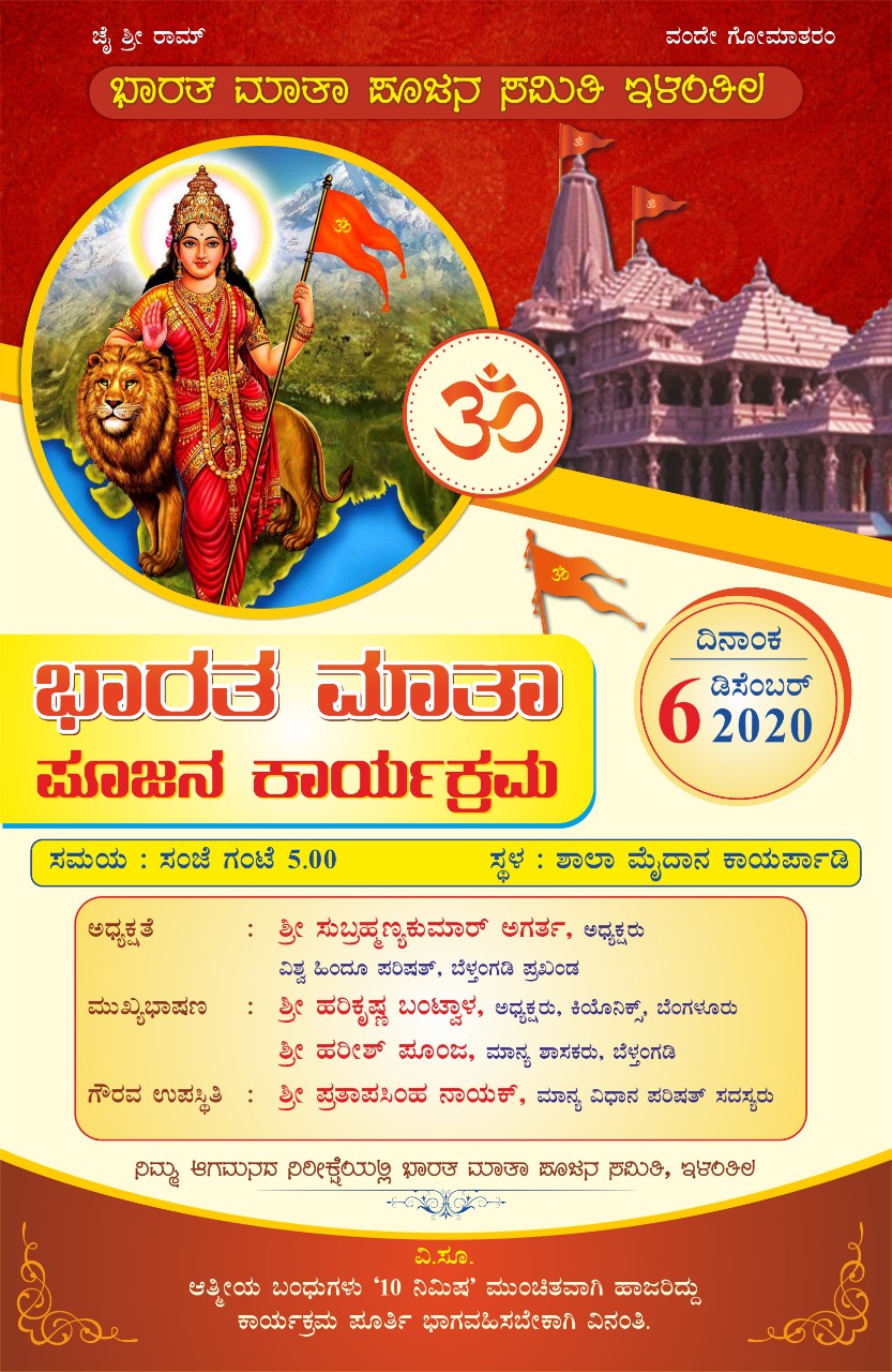 ಇಳಂತಿಲ: ಕಾಯರ್ಪಾಡಿ ಶಾಲಾ ಮೈದಾನದಲ್ಲಿ ಡಿಸೆಂಬರ್ 6ರಂದು ಭಾರತ ಮಾತಾ ಪೂಜನ ಸಮಿತಿ ವತಿಯಿಂದ ಭಾರತ ಮಾತಾ ಪೂಜನ ಕಾರ್ಯಕ್ರಮ ನಡೆಯಲಿದೆ. ಸಂಜೆ 5 ಗಂಟೆಗೆ ಈ ಕಾರ್ಯಕ್ರಮ ಆರಂಭಗೊಳ್ಳಲಿದ್ದು, ಅಧ್ಯಕ್ಷ ಸ್ಥಾನವನ್ನು ವಿಶ್ವ ಹಿಂದೂ ಪರಿಷತ್ ಬೆಳ್ತಂಗಡಿ ಪ್ರಖಂಡದ ಅಧ್ಯಕ್ಷರಾದ ಸುಬ್ರಹ್ಮಣ್ಯ ಕುಮಾರ್ ಅಗರ್ತ ಅವರು ಅಲಂಕರಿಸಲಿದ್ದಾರೆ.