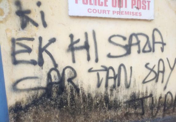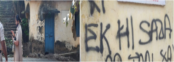 ಕಿಡಿಗೇಡಿಗಳು ಮತ್ತೊಂದು ವಿವಾದಾತ್ಮಕ ಗೋಡೆ ಬರಹ ಬರೆದಿರುವ ಘಟನೆ ಮಂಗಳೂರು ನಗರದ ಕೋರ್ಟ್ ರಸ್ತೆಯಲ್ಲಿ ನಡೆದಿದ್ದು, ವಿವಾದಾತ್ಮಕ ಗೋಡೆ ಬರಹವನ್ನು ಉರ್ದು ಭಾಷೆಯಲ್ಲಿ ಬರೆದಿದ್ದಾರೆ.