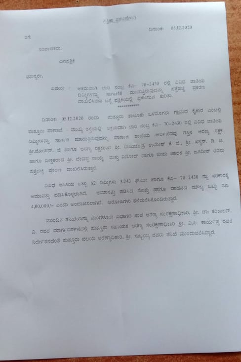 ಅಕ್ರಮವಾಗಿ ಮರ ಸಾಗಾಟ ಮಾಡುತ್ತಿದ್ದ ವೇಳೆ ಗಸ್ತಿನಲ್ಲಿದ್ದ ಪಾಣಾಜೆ ಅರಣ್ಯ ರಕ್ಷಕ ಮೋಹನ್, ರಾಜುಚಂದ್ರ, ಉಮೇಶ್ ಕೆ ಜಿ, ಅರಣ್ಯ ವೀಕ್ಷಕರಾದ ದೇವಪ್ಪ ನಾಯ್ಕ, ವಿನೋದ್ ರವರು ಲಾರಿಯನ್ನು ತಡೆದು ನಿಲ್ಲಿಸಿದ್ದಾರೆ. ಲಾರಿಯಲ್ಲಿ ವಿವಿಧ ಜಾತಿಯ 62 ದಿಮ್ಮಿಗಳನ್ನು ಮುಟ್ಟುಗೋಲು ಹಾಕಲಾಗಿದೆ. ವಶಕ್ಕೆ ಪಡೆದ ಸೊತ್ತುಗಳ ಒಟ್ಟು ಮೌಲ್ಯ ರೂ. 4 ಲಕ್ಷ ಎಂದು ಅಂದಾಜಿಸಲಾಗಿದೆ. ಮುಂದಿನ ತನಿಖೆಯನ್ನು ಮಂಗಳೂರು ವಿಭಾಗದ ಉಪ ಅರಣ್ಯ ಸಂರಕ್ಷಣಾಧಿಕಾರಿ ಡಾ. ಕರಿಕಾಲನ್, ಪುತ್ತೂರು ಸಹಾಯಕ ಅರಣ್ಯ ಸಂರಕ್ಷಣಾಧಿಕಾರಿ ವಿ ಪಿ ಕಾರ್ಯಪ್ಪ ನಿದೇರ್ಶನದಂತೆ ಪುತ್ತೂರು ವಲಯಾರಣ್ಯಾಧಿಕಾರಿ ಸುಬ್ಬಯ್ಯ ರವರು ತನಿಖೆ ಕೈಗೆತ್ತಿಕೊಂಡಿದ್ದಾರೆ.