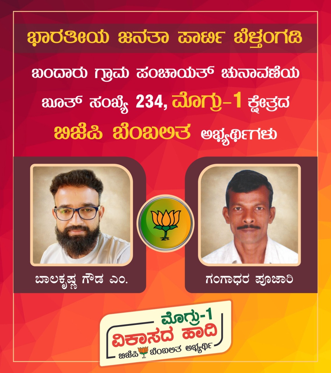 ಬಂದಾರು:ರಾಜ್ಯದಲ್ಲಿ ಗ್ರಾ.ಪಂ. ಚುನಾವಣೆಯ ಕಾವು ಶುರುವಾಗಿದ್ದು, ಈಗಾಗ್ಲೇ ಹಲವಾರು ಅಭ್ಯರ್ಥಿಗಳು ನಾಮಪತ್ರ ಸಲ್ಲಿಸಿದ್ದಾರೆ. ಅದರಂತೆ, ಬಂದಾರು ಪಂಚಾಯತ್ ವ್ಯಾಪ್ತಿಯ ಮೊಗ್ರು ಗ್ರಾಮದ 1ನೇ ಮುಗೇರಡ್ಕ ವಾರ್ಡ್ ನಿಂದ ಬಿಜೆಪಿ ಬೆಂಬಲಿತ ಸಾಮಾನ್ಯ ಅಭ್ಯರ್ಥಿಯಾಗಿ, ಕಣಿಯೂರು ಮಹಾ ಶಕ್ತಿಕೇಂದ್ರದ ಪ್ರಧಾನ ಕಾರ್ಯದರ್ಶಿ ಹಾಗೂ ತಾಲೂಕು ಸಾಮಾಜಿಕ ಜಾಲತಾಣ ಪ್ರಕೋಷ್ಟದ ಸಹ ಸಂಚಾಲಕರಾದ ಬಾಲಕೃಷ್ಣ ಗೌಡ ಎಂ. ಮತ್ತು ಹಿಂದುಳಿದ ವರ್ಗದ ಅಭ್ಯರ್ಥಿಯಾಗಿ ಗಂಗಾಧರ ಪೂಜಾರಿ ಇವರು ನಾಮಪತ್ರ ಸಲ್ಲಿಸಿದ್ದಾರೆ.
