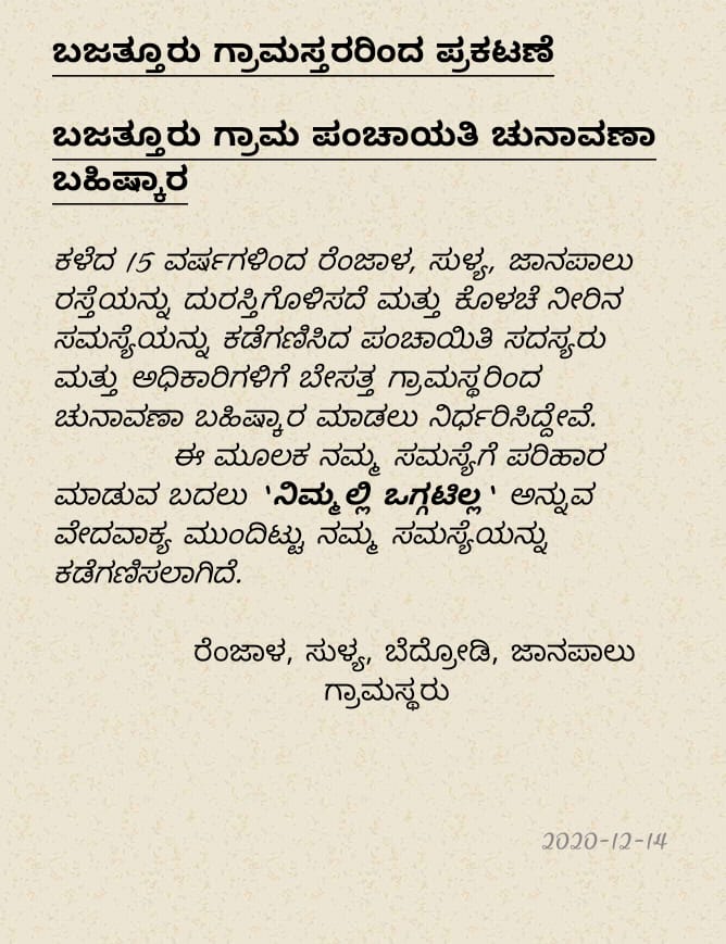ಇದರಿಂದ ಬೇಸತ್ತ ಗ್ರಾಮಸ್ಥರು ಚುನಾವಣೆ ಬಹಿಷ್ಕಾರ ಮಾಡಲು ನಿರ್ಧರಿಸಿದ್ದಾರೆ. ಹಾಗೆಯೇ ರೆಂಜಾಳ, ಸುಳ್ಯ, ಬೆದ್ರೋಡಿ, ಜಾನಪಾಲು ಗ್ರಾಮಸ್ಥರು ಈ ಮೂಲಕ ನಮ್ಮ ಸಮಸ್ಯೆಗೆ ಪರಿಹಾರ ಮಾಡುವ ಬದಲು ನಿಮ್ಮಲ್ಲಿ ಒಗ್ಗಟಿಲ್ಲ ಅನ್ನುವ ವೇದವಾಕ್ಯ ಮುಂದಿಟ್ಟು ನಮ್ಮ ಸಮಸ್ಯೆಯನ್ನು ಕಡೆಗಣಿಸಲಾಗಿದೆ ಎಂದು ಪ್ರಕಟಣೆ ಹೊರಡಿಸಿದ್ದಾರೆ.