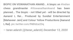 ಖ್ಯಾತ ಚೆಸ್ ಆಟಗಾರ ವಿಶ್ವನಾಥನ್ ಆನಂದ್ ಅವರ ಜೀವನಚರಿತ್ರೆಯನ್ನು ಸಿನೆಮಾ ಮಾಡಲಿದ್ದು, ಈ ಸಿನೆಮಾಗೆ ಇನ್ನೂ ಹೆಸರು ಅಂತಿಮವಾಗಿಲ್ಲ. ಸಿನೆಮಾವನ್ನು ಆನಂದ್ ಎಲ್.ರಾಯ್ ನಿರ್ದೇಶನ ಮಾಡುತ್ತಿದ್ದಾರೆ. ಸನ್ ಡಯಲ್ ಎಂಟರ್ ಟೈನ್ ಮೆಂಟ್ ಮತ್ತು ಕಲರ್ ಎಲ್ಲೊ ಪ್ರೊಡಕ್ಷನ್ ನಿರ್ಮಾಣದ ಹೊಣೆ ಹೊತ್ತಿದೆ. ಎಂದು ಟ್ರೇಡ್ ಅನಾಲಿಸ್ಟ್ ತಾರನ್ ಆದರ್ಶ್ ಟ್ವೀಟ್ ಮಾಡಿದ್ದಾರೆ. ಇನ್ನು ನಿರ್ದೇಶಕ ಆನಂದ್ ರಾಯ್ ಸದ್ಯ ಅಕ್ಷಯ್ ಕುಮಾರ್, ಧನುಷ್ ಮತ್ತು ಸಾರಾ ಅಲಿ ಖಾನ್ ನಟನೆಯ ‘ಅಟಂಗ್ರಿ ರೇ’ ಸಿನೆಮಾವನ್ನು ನಿರ್ದೇಶನ ಮಾಡುತ್ತಿದ್ದಾರೆ.