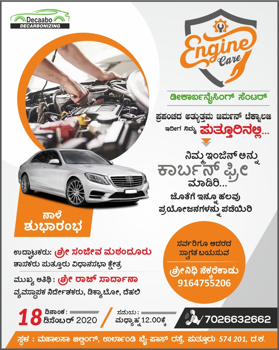 ಪುತ್ತೂರು: ಪ್ರಪಂಚದ ಅತ್ಯುತ್ತಮ ಜರ್ಮನ್ ಟೆಕ್ನಾಲಜಿಯ ಇಂಜಿನ್ ಕಾರ್ ಡೀಕಾರ್ಬನೈಸಿಂಗ್ ಸೆಂಟರ್ ನಾಳೆ ಮಹಾಲಸಾ ಬಿಲ್ಡಿಂಗ್, ಉರ್ಲಾಂಡಿ ಬೈಪಾಸ್ ರಸ್ತೆ ಪುತ್ತೂರಿನಲ್ಲಿ ಶುಭಾರಂಭಗೊಳ್ಳಲಿದೆ.