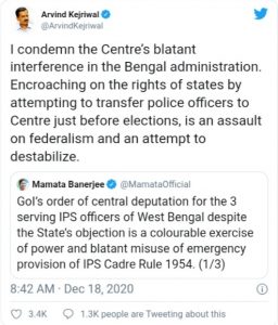 ನವದೆಹಲಿ: ದೆಹಲಿ ಸಿಎಂ ಅರವಿಂದ ಕೇಜಿವಾಲ್ ಅವರು “ಪಶ್ಚಿಮ ಬಂಗಾಳದ ಮೂವರು ಐಪಿಎಸ್ ಅಧಿಕಾರಿಗಳನ್ನು ಕೇಂದ್ರದ ಸೇವೆಗೆ ವರ್ಗಾವಣೆ ಮಾಡಿದ ಕೇಂದ್ರದ ಹಸ್ತಕ್ಷೇಪವನ್ನು ನಾನು ಖಂಡಿಸುತ್ತೇನೆ” ಎಂದು ಟ್ವೀಟ್ ಮಾಡಿದ್ದಾರೆ.