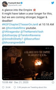 ಬೆಂಗಳೂರು:ಜನವರಿ 8ರಂದು ಬಹುನಿರೀಕ್ಷಿತ ಕೆಜಿಎಫ್– ಚಾಪ್ಟರ್ 2 ಸಿನಿಮಾದ ಟೀಸರ್ ಅನ್ನು ಬಿಡುಗಡೆ ಮಾಡುವುದಾಗಿ ನಿರ್ದೇಶಕ ಪ್ರಶಾಂತ್ ನೀಲ್ ತಿಳಿಸಿದ್ದಾರೆ.