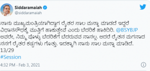 ಹಾಗೂ ಅವರು, ರಾಜ್ಯಪಾಲರಿಂದ ಸರ್ಕಾರ ಮಾಡಿಸಿದ್ದ ಭಾಷಣದಲ್ಲಿ ಒಂದಷ್ಟು ಸುಳ್ಳಿನ ಕಂತೆಗಳಿವೆ, ಒಂದಷ್ಟು ತಪ್ಪು ಮಾಹಿತಿಗಳಿವೆ, ಜೊತೆಗೆ ಸರ್ಕಾರದ ಮಾನ ಉಳಿಸಿಕೊಳ್ಳಲು ನಿರ್ಲಜ್ಜವಾಗಿ ಹೇಳಿಕೊಂಡ ಹಿಂದಿನ ನಮ್ಮ ಸರ್ಕಾರದ ಸಾಧನೆಗಳಿವೆ. ಇದನ್ನು ಹೊರತುಪಡಿಸಿ ಸತ್ಯನೂ ಇಲ್ಲ, ಸತ್ವವೂ ಇಲ್ಲ ಎಂದು ಅಧಿವೇಶನದ ಹೇಳಿಕೆಯನ್ನು ಟ್ವೀಟ್ ಮಾಡಿದ್ದಾರೆ. ಕಳೆದ ವರ್ಷ ನೀತಿ ಆಯೋಗವು ನಾವಿನ್ಯತಾ ಸೂಚ್ಯಂಕದಲ್ಲಿ ಕರ್ನಾಟಕಕ್ಕೆ ಮೊದಲ ಸ್ಥಾನ ನೀಡಿದ್ದು, ಇದನ್ನು ಬಿಜೆಪಿ ಸರ್ಕಾರ ತನ್ನ ಸಾಧನೆ ಎಂದು ರಾಜ್ಯಪಾಲರ ಮೂಲಕ ಸುಳ್ಳು ಹೇಳಿಸಿದೆ. ಕೌಶಲ್ಯಾಭಿವೃದ್ಧಿ ಇಲಾಖೆ ಸ್ಥಾಪನೆ ಮಾಡಿ, ವಾರ್ಷಿಕ 5 ಲಕ್ಷ ಮಂದಿಗೆ ಕೌಶಲ್ಯ ತರಬೇತಿ ನೀಡಿದ್ದ ನಮ್ಮ ಸರ್ಕಾರ. ಇದರಲ್ಲಿ ಬಿಜೆಪಿಯವರ ಸಾಧನೆ ಏನಿದೆ? ಎಂದು ಪ್ರಶ್ನಿಸಿದ್ದಾರೆ. ಅಲ್ಲದೇ ನಾನು ಮುಖ್ಯಮಂತ್ರಿಯಾಗಿದ್ದಾಗ ನಮ್ಮ ಸರ್ಕಾರ ಟೇಕ್ ಆಫ್ ಆಗಿಲ್ಲ, ಟೇಕ್ ಆಫ್ ಆಗಿಲ್ಲ ಎಂದು ಇದೇ ಸದನದಲ್ಲಿ ಬಿಜೆಪಿ ನಾಯಕರು ಬೊಬ್ಬೆ ಹಾಕುತ್ತಿದ್ದರು. ಈಗಿನ ಸರ್ಕಾರ ಟೇಕ್ ಆಫ್ ಅಲ್ಲ ಸಂಪೂರ್ಣ ಆಫ್ ಆಗಿ ನಡುರಸ್ತೆಯಲ್ಲಿ ಕೆಟ್ಟು ನಿಂತಿರುವ ಹಳೆ ಡಕೋಟ ಬಸ್ನಂತಾಗಿದೆ ಎಂದು ವ್ಯಂಗ್ಯವಾಡಿದ್ದಾರೆ. ಅಲ್ಲದೇ ಮುಖ್ಯಮಂತ್ರಿ ಬಿ.ಎಸ್.ಯಡಿಯೂರಪ್ಪ ಅವರಿಗೆ ಡ್ರೈವಿಂಗ್ ಮೊದಲೇ ಬರೋದಿಲ್ಲ, ಜೊತೆಗೆ ನಾಲ್ಕು ದಿಕ್ಕುಗಳಿಂದಲೂ ಕಾಲೆಳೆಯುತ್ತಿರುವ ಸ್ವಪಕ್ಷದವರ ಕಾಟ. ಬಸ್ ಮುಂದಕ್ಕೆ ಹೇಗೆ ಹೋಗೋದು? ಇಂತಹ ಸರ್ಕಾರವನ್ನು ರಿಪೇರಿ ಮಾಡಲಾಗುವುದಿಲ್ಲ, ರಿಪ್ಲೇಸ್ ಮಾಡಬೇಕಾಗುತ್ತದೆ ಅಷ್ಟೇ. ಆ ಕಾಲ ಸದ್ಯದಲ್ಲಿಯೇ ಬರಲಿದೆ ಎಂದಿದ್ದಾರೆ. ಹಾಗೂ ದೇಶದ ರೈತರು ಸಂಕಷ್ಟದಲ್ಲಿದ್ದಾರೆ. ಒಂದೆಡೆ ಅತಿವೃಷ್ಟಿ ಮತ್ತು ಕೊರೊನಾ ಹಾವಳಿಯ ಪ್ರಕೃತಿ ವಿಕೋಪ, ಇನ್ನೊಂದೆಡೆ ಬಿಜೆಪಿ ಸರ್ಕಾರದ ಕೃಷಿ ವಿರೋಧಿ ಕಾನೂನುಗಳ ಮಾನವ ನಿರ್ಮಿತ ವಿಕೋಪ. ಕಷ್ಟ-ನಷ್ಟಗಳಲ್ಲಿ ಬೆಂದು ಹೋಗಿರುವ ರೈತರು ದೇಶಾದ್ಯಂತ ಬೀದಿಗಿಳಿದಿದ್ದಾರೆ. ಇಡೀ ದೇಶವೇ ಜ್ವಾಲಾಮುಖಿಯಂತಾಗಿದೆ, ಅದು ಯಾವಾಗ ಸಿಡಿಯುತ್ತೋ ಗೊತ್ತಿಲ್ಲ ಎಂದು ಹೇಳಿದ್ದು, ಬೆಳೆಗಳ ಬೆಲೆ ಕುಸಿತ ತಡೆಯಲು ರೂ. 5,000 ಕೋಟಿ ವೆಚ್ಚದ ರೈತಬಂಧು ಮಾರುಕಟ್ಟೆ ಮಧ್ಯಪ್ರವೇಶ ನಿಧಿ, ರೈತರ ಮಕ್ಕಳ ಶಿಕ್ಷಣಕ್ಕೆ ನೂರು ಕೋಟಿ ರೂಪಾಯಿಗಳ ರೈತಬಂಧು ವಿದ್ಯಾರ್ಥಿ ವೇತನ ನಿಧಿ. ಬಿಜೆಪಿ ಪಕ್ಷದ ಪ್ರಣಾಳಿಕೆಯ ಈ ಭರವಸೆಗಳು ಈಡೇರಿವೆಯೇ? ಎಂದು ಪ್ರಶ್ನಿಸಿದ್ದಾರೆ. ಹಾಗೂ ರೈತರು ಮಾತ್ರವಲ್ಲ ಮಹಿಳೆಯರು, ಯುವಕರು,ಕಾರ್ಮಿಕರು, ದಲಿತರು, ಹಿಂದುಳಿದ ಜಾತಿಗಳು, ಅಲ್ಪಸಂಖ್ಯಾತರು.. ಹೀಗೆ ಯಾವುದೇ ಜನವರ್ಗಕ್ಕೆ ಪ್ರಣಾಳಿಕೆಯಲ್ಲಿ ನೀಡಿರುವ ಭರವಸೆಗಳನ್ನು ಬಿಜೆಪಿ ಸರ್ಕಾರ ಈಡೇರಿಸಿಲ್ಲ ಎಂದು ಆರೋಪಿಸಿದ್ದಾರೆ. ಹಾಗೂ ಮುಖ್ಯಮಂತ್ರಿ ಬಿ.ಎಸ್.ಯಡಿಯೂರಪ್ಪ ಅವರೇ, ನೀವು ಅಧಿಕಾರಕ್ಕೆ ಬಂದು ಹದಿನೆಂಟು ತಿಂಗಳುಗಳಾಯಿತು. ಈ ಅವಧಿಯಲ್ಲಿ ನಿಮ್ಮ ಸರ್ಕಾರದ ಸಾಧನೆಯನ್ನು ನಿಮ್ಮ ಪಕ್ಷದ ಪ್ರಣಾಳಿಕೆಯ ಜೊತೆ ಓದಿಕೊಳ್ಳಿ. ನಿಮಗೆ ಆತ್ಮಸಾಕ್ಷಿ ಎಂಬುದು ಎಲ್ಲಾದರೂ ಉಳಿದುಕೊಂಡಿದ್ದರೆ ನೀವು ಖಂಡಿತ ಒಂದು ಕ್ಷಣ ಕೂಡಾ ಆ ಕುರ್ಚಿಯಲ್ಲಿ ಕೂರಲು ಸಾಧ್ಯವಿಲ್ಲ ಎಂದು ಹೇಳಿದ್ದಾರೆ. ನಾನು ಮುಖ್ಯಮಂತ್ರಿಯಾಗಿದ್ದಾಗ ರೈತರ ಸಾಲ ಮನ್ನಾ ಮಾಡದೆ ಇದ್ದರೆ ವಿಧಾನಸೌಧಕ್ಕೆ ಮುತ್ತಿಗೆ ಹಾಕುತ್ತೇವೆ ಎಂದು ಬೆದರಿಕೆ ಹಾಕಿದಿರಿ. ಬಿ.ಎಸ್.ಯಡಿಯೂರಪ್ಪ ಅವರೇ, ನಿಮ್ಮ ಪೆÇಳ