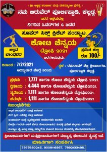 ಕಲ್ಲಡ್ಕ : ನಮ ಬಿರುವೆರ್ ಪೂರ್ಲಿಪ್ಪಾಡಿ, ಕಲ್ಲಡ್ಕ ಇದರ ಆಶ್ರಯದಲ್ಲಿ ಬಿಲ್ಲವ ಬಾಂಧವರ ನಿಗದಿತ ಓವರ್ ಗಳ 6 ಜನರ ಸೂಪರ್ ಸಿಕ್ಸ್ ಕ್ರಿಕೆಟ್ ಪಂದ್ಯಾಟವು ನಾಳೆ ಬೆಳಗ್ಗೆ 9 ಗಂಟೆಯಿಂದ ರಘರಾಮ್ ಶೆಟ್ಟಿ ಕ್ರೀಡಾಂಗಣ, ಪೂರ್ಲಿಪ್ಪಾಡಿ ಕಲ್ಲಡ್ಕ, ಇಲ್ಲಿ ಕೋಟಿ ಚೆನ್ನಯ ಟ್ರೋಫಿ-2021 ನಡೆಯಲಿದೆ.