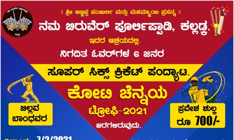 ನಮ ಬಿರುವೆರ್ ಪೂರ್ಲಿಪ್ಪಾಡಿ, ಕಲ್ಲಡ್ಕ ಇದರ ಆಶ್ರಯದಲ್ಲಿ ನಾಳೆ ಸೂಪರ್ ಸಿಕ್ಸ್ ಕ್ರಿಕೆಟ್ ಪಂದ್ಯಾಟ-ಕಹಳೆ ನ್ಯೂಸ್