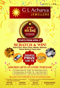 ಚಿನ್ನಾಭರಣ ಪ್ರೇಮಿಗಳಿಗೊಂದು ಸಿಹಿಸುದ್ದಿ ; ನಿಮ್ಮ ಜಿ.ಎಲ್. ಆಚಾರ್ಯ ಜ್ಯುವೆಲ್ಲರ್ಸ್ನಲ್ಲಿ `ವರುಷದ ಹರುಷ’ ಸಂಭ್ರಮಕ್ಕೆ ಚಾಲನೆ – ಕಹಳೆ ನ್ಯೂಸ್
