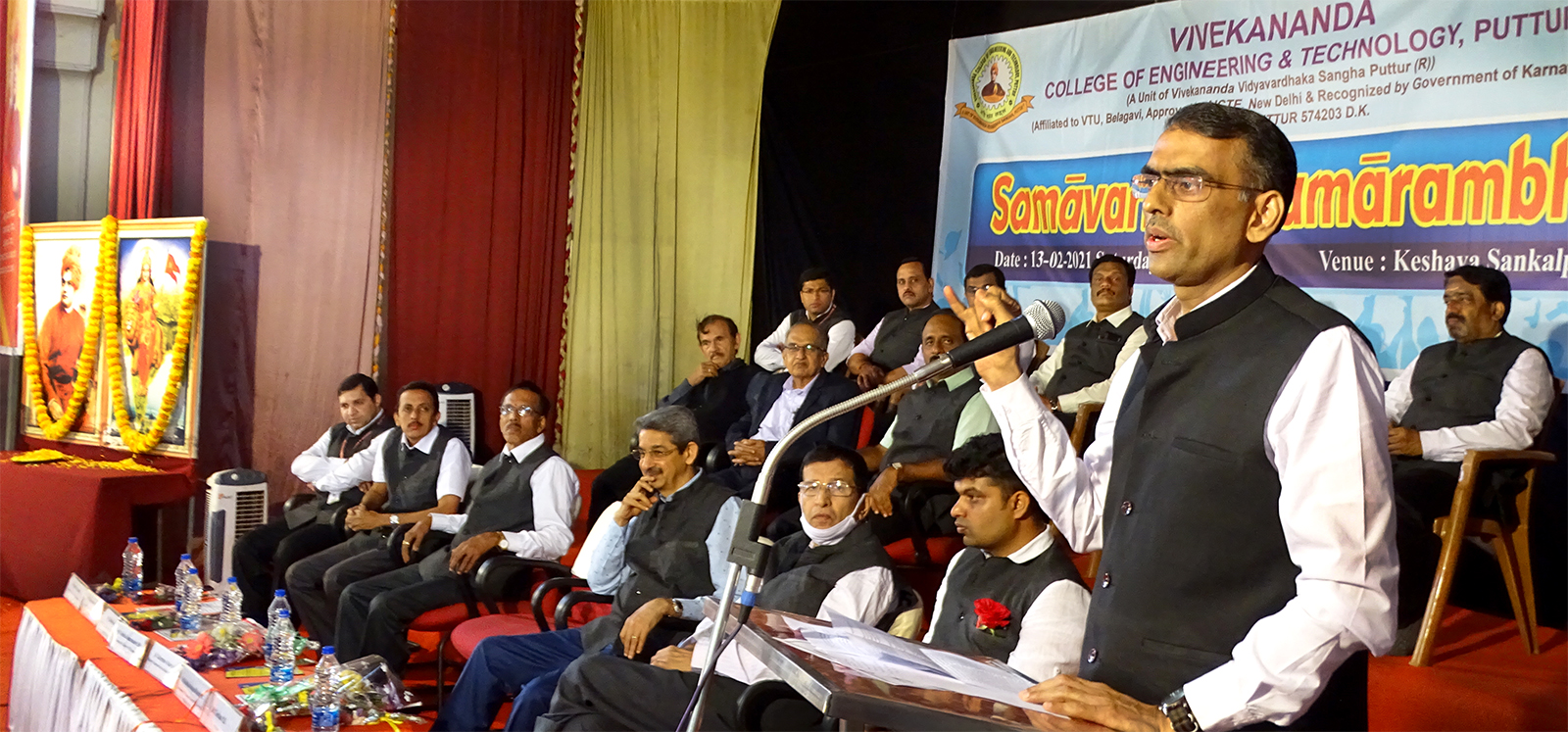 ಕಲಿಕೆಯಿಂದ ಸೃಜನಶೀಲತೆ, ಸೃಜನಶೀಲತೆಯಿಂದ ಆಲೋಚನೆಗಳು, ಆಲೋಚನೆಗಳಿಂದ ಜ್ಞಾನ ದೊರೆಯುತ್ತದೆ. ಜ್ಞಾನವು ನಮ್ಮ ಬದುಕನ್ನು ಮುನ್ನಡೆಸುತ್ತದೆ ಎಂದು ಹೇಳಿದರು. ತನ್ನ ಜೀವನಾನುಭವವನ್ನು ಪದವೀಧರರೊಂದಿಗೆ ಹಂಚಿಕೊಂಡ ಅವರು ತಾನು ಚಿಕ್ಕಂದಿನಲ್ಲಿ ನಿಗದಿಪಡಿಸಿಕೊಂಡ ಗುರಿಯನ್ನು ಸಾಧಿಸಿದಾಗ ಸಿಗುವ ಆನಂದ ಅವರ್ಣನೀಯ ಎಂದರು. ಸಾಧಕನಿಗೆ ಕೊನೆ ಎಂಬುದಿಲ್ಲ. ಆಕಾಶದೆತ್ತರದವರೆಗೂ ಅವಕಾಶಗಳಿವೆ ಅದನ್ನು ಬಳಸಿಕೊಳ್ಳುವ ಛಾತಿ ನಮ್ಮಲ್ಲಿರಬೇಕು ಎಂದರು. ಸಮಾರಂಭದ ಅಧ್ಯಕ್ಷತೆ ವಹಿಸಿದ್ದ ವಿವೇಕಾನಂದ ವಿದ್ಯಾವರ್ಧಕ ಸಂಘದ ನಿರ್ದೇಶಕ ಶ್ರೀ.ಬಲರಾಮ ಆಚಾರ್ಯ.ಜಿ. ಮಾತನಾಡಿ ಪದವಿಯನ್ನು ಪೂರೈಸಿ ನೀವು ಸಾಧ್ಯತೆಗಳ ಪ್ರಪಂಚಕ್ಕೆ ಕಾಲಿರಿಸಿದ್ದೀರಿ. ಇಲ್ಲಿ ಅಪಾರ ಅವಕಾಶಗಳು ಲಭ್ಯವಿವೆ ಅವನ್ನು ಬಾಚಿಕೊಳ್ಳಬೇಕು ಎಂದು ಹೇಳಿದರು. ಕೊರೋನೋತ್ತರದ ದಿನಗಳಲ್ಲಿ ತಾಂತ್ರಿಕ ಕ್ಷೇತ್ರದಲ್ಲಿ ವಿಪುಲ ಅವಕಾಶಗಳಿವೆ. ಉದ್ಯೋಗ ಹುಡುಕುವ ಬದಲಿಗೆ ಉದ್ಯೋಗದಾತರಾಗುವ ಮನಮಾಡಬೇಕು ಎಂದರು. ಸಮಾಜದಿಂದ ಉಪಕೃತರಾದ ನಾವು ಸಮಾಜಕ್ಕೆ ನಮ್ಮಿಂದಾದ ಸೇವೆ ಸಲ್ಲಿಸದೇ ಹೋದರೆ ನಮ್ಮ ವ್ಯಕ್ತಿತ್ವಕ್ಕೆ ಘನೆತೆಯಿಲ್ಲ ಎಂದರು. ತಾವು ಕಲಿತ ಸಂಸ್ಥೆಯ ಬಗ್ಗೆ ಉತ್ತಮ ವಿಷಯಗಳನ್ನು ಪಸರಿಸಿ ಸಂಸ್ಥೆಯ ಉನ್ನತಿಗೆ ಸಹಕಾರವನ್ನು ನೀಡಬೇಕೆಂದು ಕರೆನೀಡಿದರು. ಪ್ರತಿ ವಿಭಾಗದಲ್ಲೂ ಶೈಕ್ಷಣಿಕವಾಗಿ ಉತ್ತಮ ಸಾಧನೆಯನ್ನು ಮಾಡಿದ ಪ್ರತಿಭಾವಂತ ವಿದ್ಯಾರ್ಥಿಗಳನ್ನು ಗೌರವಿಸಲಾಯಿತು. 2019-20ನೇ ಸಾಲಿನಲ್ಲಿ ಪದವಿಯನ್ನು ಪೂರೈಸಿದ ವಿದ್ಯಾರ್ಥಿಗಳಿಗೆ ಪದವಿ ಪ್ರಧಾನ ಮಾಡಲಾಯಿತು. ಕಾಲೇಜು ಆಡಳಿತ ಮಂಡಳಿಯ ಅಧ್ಯಕ್ಷ ಸತೀಶ್ ರಾವ್ ಪಿ., ಸಂಚಾಲಕ ಶ್ರೀ.ರಾಧಾಕೃಷ್ಣ ಭಕ್ತ, ಕೋಶಾಧಿಕಾರಿ ಶ್ರೀ.ಮುರಳೀಧರ ಭಟ್, ನಿರ್ದೇಶಕರಾದ ರವಿಕೃಷ್ಣ.ಡಿ. ಕಲ್ಲಾಜೆ, ಕಾಲೇಜು ಸಲಹಾ ಸಮಿತಿಯ ಸದಸ್ಯರಾದ ಪದ್ಮಶ್ರೀ ಗಿರೀಶ್ ಭಾರದ್ವಾಜ್, ಶ್ರೀ ರಾಮ್ ಕುಮಾರ್ ಹಾಗೂ ವಿವಿದ ವಿಭಾಗಗಳ ಮುಖ್ಯಸ್ಥರು ವೇದಿಕೆಯಲ್ಲಿ ಉಪಸ್ಥಿತರಿದ್ದರು. ಕಾಲೇಜಿನ ಪೇರೆಂಟ್ ರಿಲೇಶನ್ ಸೆಲ್ನ ಕಾರ್ಯದರ್ಶಿ ಶ್ರೀಮತಿ ಶಶಿಕಲಾ, ವಿದ್ಯಾರ್ಥಿಗಳ ಹೆತ್ತವರು, ಪೋಷಕರು ಸಮಾರಂಭದಲ್ಲಿ ಹಾಜರಿದ್ದರು. ಪ್ರಾಂಶುಪಾಲ ಡಾ.ಮಹೇಶ್ಪ್ರಸನ್ನ ಕೆ. ಸ್ವಾಗತಿಸಿ ಪ್ರಸ್ತಾವನೆಗೈದರು. ಸಿವಿಲ್ ಇಂಜಿನಿಯರಿಂಗ್ ವಿಭಾಗ ಮುಖ್ಯಸ್ಥ ಡಾ.ಆನಂದ್.ವಿ.ಆರ್ ಅತಿಥಿಗಳನ್ನು ಪರಿಚಯಿಸಿದರು. ಕಾರ್ಯಕ್ರಮ ಸಂಯೋಜಕ ಡಾ.ಚೇತನ್.ಪಿ.ಡಿ ವಂದಿಸಿದರು. ಪ್ರೊ. ಪ್ರಭಾ.ಜಿ.ಎಸ್ ಮತ್ತು ಪ್ರೊ. ಭಾನುಪ್ರಿಯಾ ಕಾರ್ಯಕ್ರಮ ನಿರ್ವಹಿಸಿದರು.