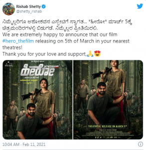 ಈ ಕುರಿತು ರಿಷಬ್ ಶೆಟ್ಟಿ ಅವರು ನಿಮ್ಮೆಲ್ಲರಿಗೂ ಅಶೋಕವನ ಎಸ್ಟೇಟಿಗೆ ಸ್ವಾಗತ. ಹೀರೊ ಸಿನೆಮಾ ಮಾರ್ಚ್ 5ಕ್ಕೆ ಚಿತ್ರಮಂದಿರಗಳಲ್ಲಿ ಬಿಡುಗಡೆ. ನಿಮ್ಮೆಲ್ಲರ ಪ್ರೀತಿಯಿರಲಿ ಎಂದು ಕುರಿತು ಟ್ವೀಟ್ ಮಾಡಿದ್ದಾರೆ. ಇನ್ನು ಈ ಸಿನಿಮಾದಲ್ಲಿ ರಿಷಬ್ ಶೆಟ್ಟಿ ಮತ್ತು ಮಗಳು ಜಾನಕಿ ಖ್ಯಾತಿಯ ಗಾನವಿ ಲಕ್ಷಣ್ ಪ್ರಮುಖ ಪಾತ್ರದಲ್ಲಿ ಅಭಿನಯಿಸಿದ್ದು, ರಿಷಬ್ ಈ ಚಿತ್ರದ ನಿರ್ಮಾಣದ ಹೊಣೆಯನ್ನು ಹೊತ್ತಿದ್ದಾರೆ ಎನ್ನಲಾಗಿದೆ. ಅಲ್ಲದೇ ಬಿಡುಗಡೆ ದಿನಾಂಕದೊಂದಿಗೆ ಚಿತ್ರದ ಪೋಸ್ಟರ್ವೊಂದನ್ನು ರಿಷಬ್ ಹಂಚಿಕೊಂಡಿದ್ದು, ಪೋಸ್ಟರ್ನಲ್ಲಿ ರಕ್ತಸಿಕ್ತ ಮುಖದೊಂದಿಗೆ ಗನ್ ಹಿಡಿದು ಕುಳಿತಿರುವ ಅವರ ಹಿಂದೆ ಗನ್ ಹಿಡಿದು ನಾಯಕಿ ನಿಂತಿದ್ದಾರೆ.