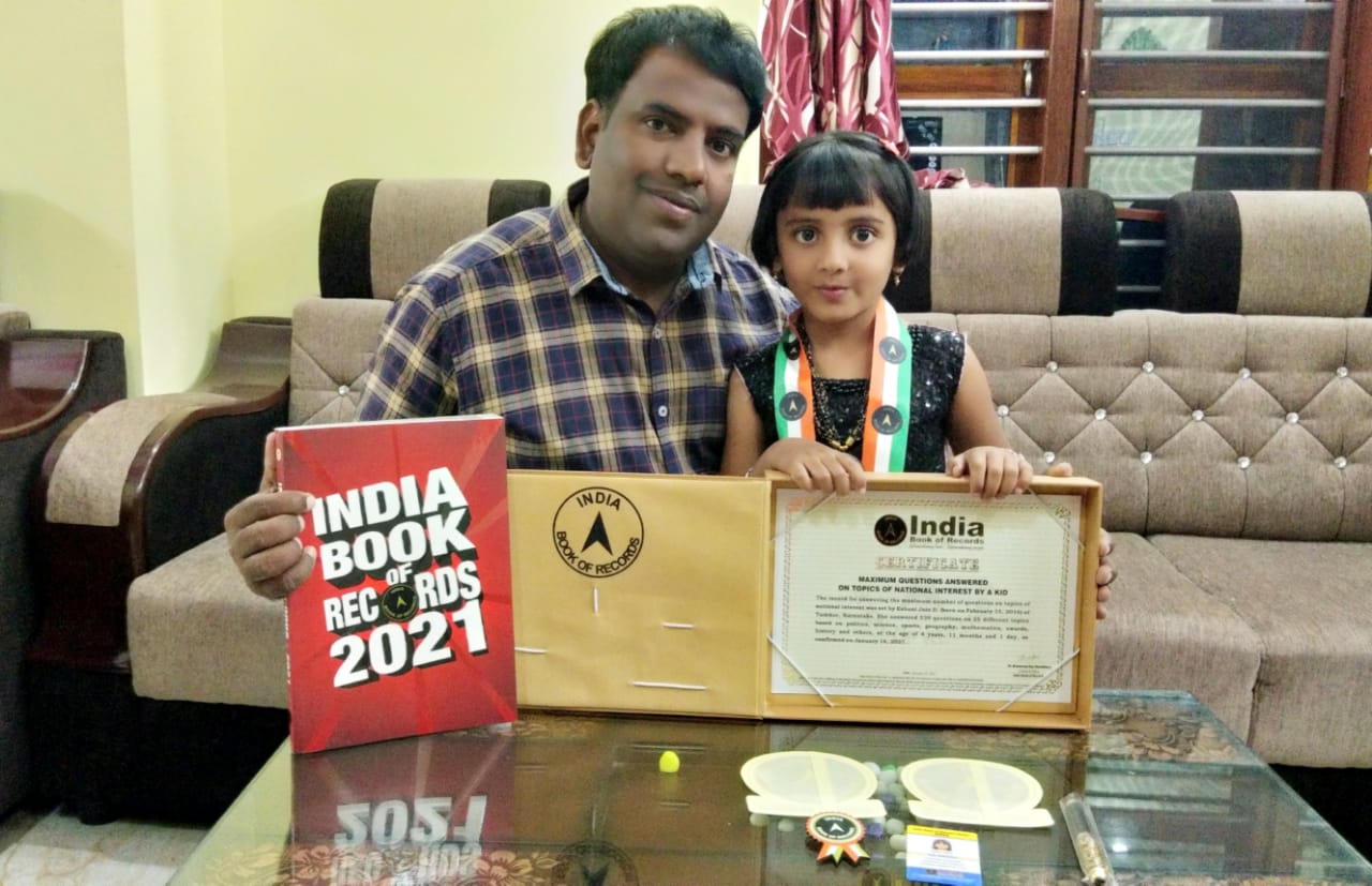 ತುಮಕೂರು: ತುಮಕೂರಿನ 4000 ಕ್ಕೂ ಹೆಚ್ಚು ಪ್ರಶ್ನೆಗಳಿಗೆ ಉತ್ತರಿಸುವ ಕೇವಲ ನಾಲ್ಕು ವರ್ಷದ ಬಾಲಕಿ ಇಶಾನಿ ಜೈನ್ .ಡಿ ಯ ಸಾಧನೆಯು ಇಂಡಿಯನ್ ಬುಕ್ ಆಫ್ ರೆಕಾರ್ಡ್ ಪಟ್ಟಿಗೆ ಸೇರಿದೆ.