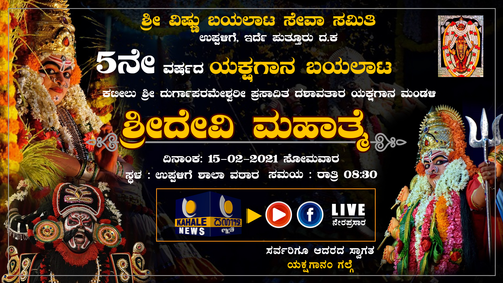 ಇಂದು ಉಪ್ಪಳಿಗೆಯಲ್ಲಿ ಕಟೀಲು ಮೇಳದವರಿಂದ ಶ್ರೀವಿಷ್ಣು ಬಯಲಾಟ ಸೇವಾ ಸಮಿತಿಯವರು ಅರ್ಪಿಸುವ 5ನೇ ವರ್ಷದ ಅದ್ದೂರಿ ಯಕ್ಷಗಾನ ಬಯಲಾಟ ಶ್ರೀದೇವಿ ಮಹಾತ್ಮೆ – ಕಹಳೆ ನ್ಯೂಸ್