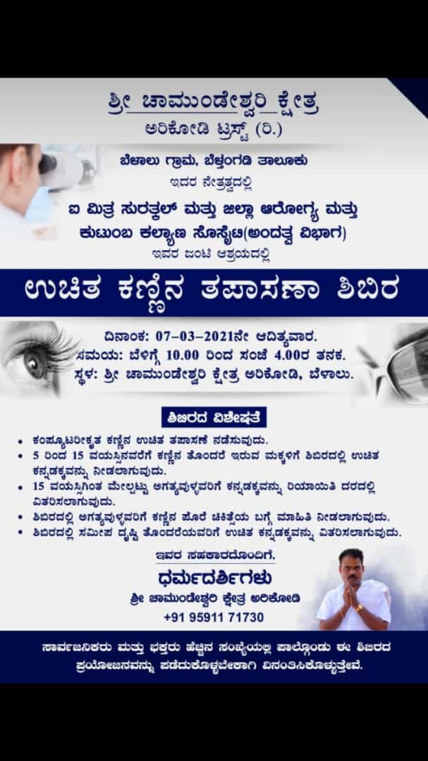 ಬೆಳ್ತಂಗಡಿಯ ಶ್ರೀ ಚಾಮುಂಡೇಶ್ವರಿ ಕ್ಷೇತ್ರ ಅರಿಕೋಡಿ, ಬೆಳಾಲುನಲ್ಲಿ ಮಾರ್ಚ್ 7ರಂದು ಉಚಿತ ಕಣ್ಣಿನ ತಪಾಸಣಾ ಶಿಬಿರ-ಕಹಳೆ ನ್ಯೂಸ್