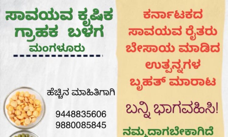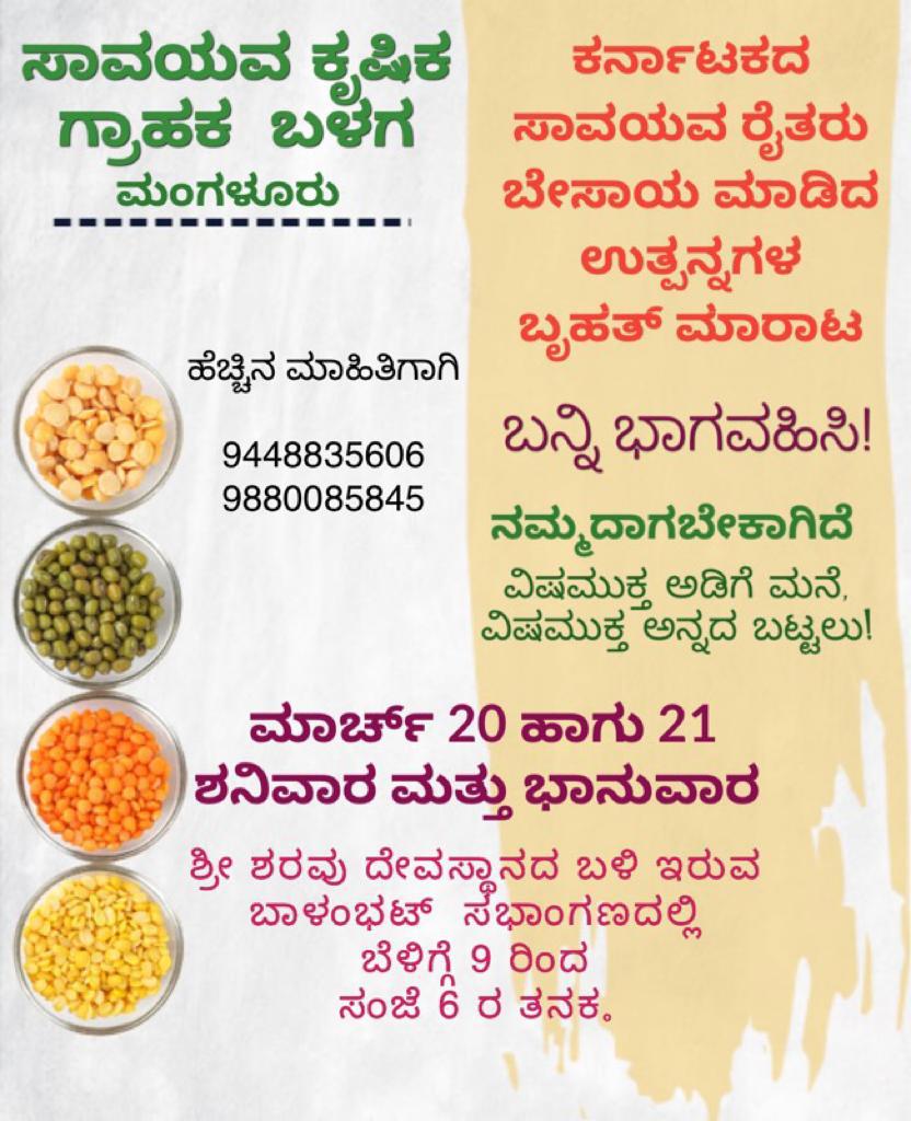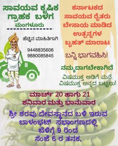 ಸಾವಯವ ಕೃಷಿಕ ಗ್ರಾಹಕ ಬಳಗ ಮಂಗಳೂರು, ಕರ್ನಾಟಕದ ಸಾವಯವ ರೈತರು ಬೇಸಾಯ ಮಾಡಿದ ಉತ್ಪನ್ನಗಳ ಬೃಹತ್ ಮಾರಾಟ ಮಾರ್ಚ್ 20 ಮತ್ತು 21 ರಂದು ಬೆಳಿಗ್ಗೆ 9ರಿಂದ ಸಂಜೆ 6ರ ತನಕ ಶ್ರೀ ಶರವು ದೇವಸ್ಥಾನದ ಬಳಿ ಇರುವ ಬಾಳಂಭಟ್ ಸಭಾಂಗಣದಲ್ಲಿ ನಡೆಯಲಿದೆ.