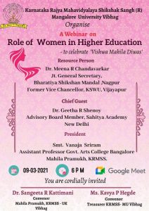 ವಿಶ್ವ ಮಹಿಳಾ ದಿನಾಚರಣೆಯ ಅಂಗವಾಗಿ ನಾಳೆ ಉನ್ನತ ಶಿಕ್ಷಣದಲ್ಲಿ ಮಹಿಳೆಯರ ಪಾತ್ರ ಎಂಬ ಕುರಿತು ವೆಬಿನಾರ್ –ಕಹಳೆ ನ್ಯೂಸ್