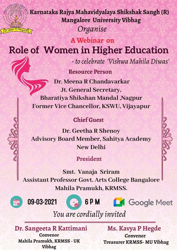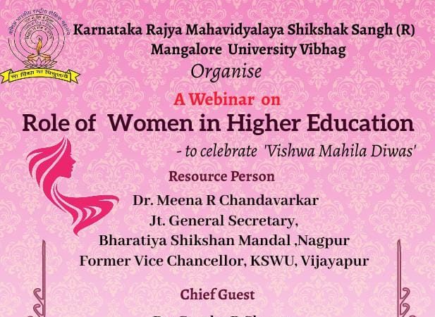 ಮಂಗಳೂರು : ವಿಶ್ವ ಮಹಿಳಾ ದಿನಾಚರಣೆಯ ಅಂಗವಾಗಿ ಕರ್ನಾಟಕ ರಾಜ್ಯ ಮಹಾವಿದ್ಯಾಲಯ ಶಿಕ್ಷಕ ಸಂಘ (ರಿ) ಮಂಗಳೂರು ವಿಶ್ವವಿದ್ಯಾನಿಲಯ ವಿಭಾಗವು ಮಾರ್ಚ್ 9 ರಂದು ಸಂಜೆ 6 ಗಂಟೆಗೆ ‘ಉನ್ನತ ಶಿಕ್ಷಣದಲ್ಲಿ ಮಹಿಳೆಯರ ಪಾತ್ರ’ ಎಂಬ ಕುರಿತು ವೆಬಿನಾರನ್ನು ಹಮ್ಮಿಕೊಂಡಿದೆ.
