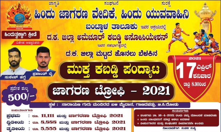 ಬಂಟ್ವಾಳ : ಹಿಂದೂ ಜಾಗರಣ ವೇದಿಕೆ, ಹಿಂದು ಯುವವಾಹಿನಿ ಬಂಟ್ವಾಳ ತಾಲೂಕು ಇವರ ಆಶ್ರಯದಲ್ಲಿ ಹಾಗೂ ದ.ಕ. ಜಿಲ್ಲಾ ಅಮೆಚೂರ್ ಕಬ್ಬಡ್ಡಿ ಅಸೋಸಿಯೇಶನ್ ಇವರ ಸಹಭಾಗಿತ್ವದಲ್ಲಿ ದ.ಕ. ಜಿಲ್ಲಾ ಮಟ್ಟದ ಹೊನಲು ಬೆಳಕಿನ ಮುಕ್ತ ಕಬ್ಬಡ್ಡಿ ಪಂದ್ಯಾಟ ಜಾಗರಣ ಟ್ರೋಫಿ-2021 ಜರುಗಲಿದೆ.