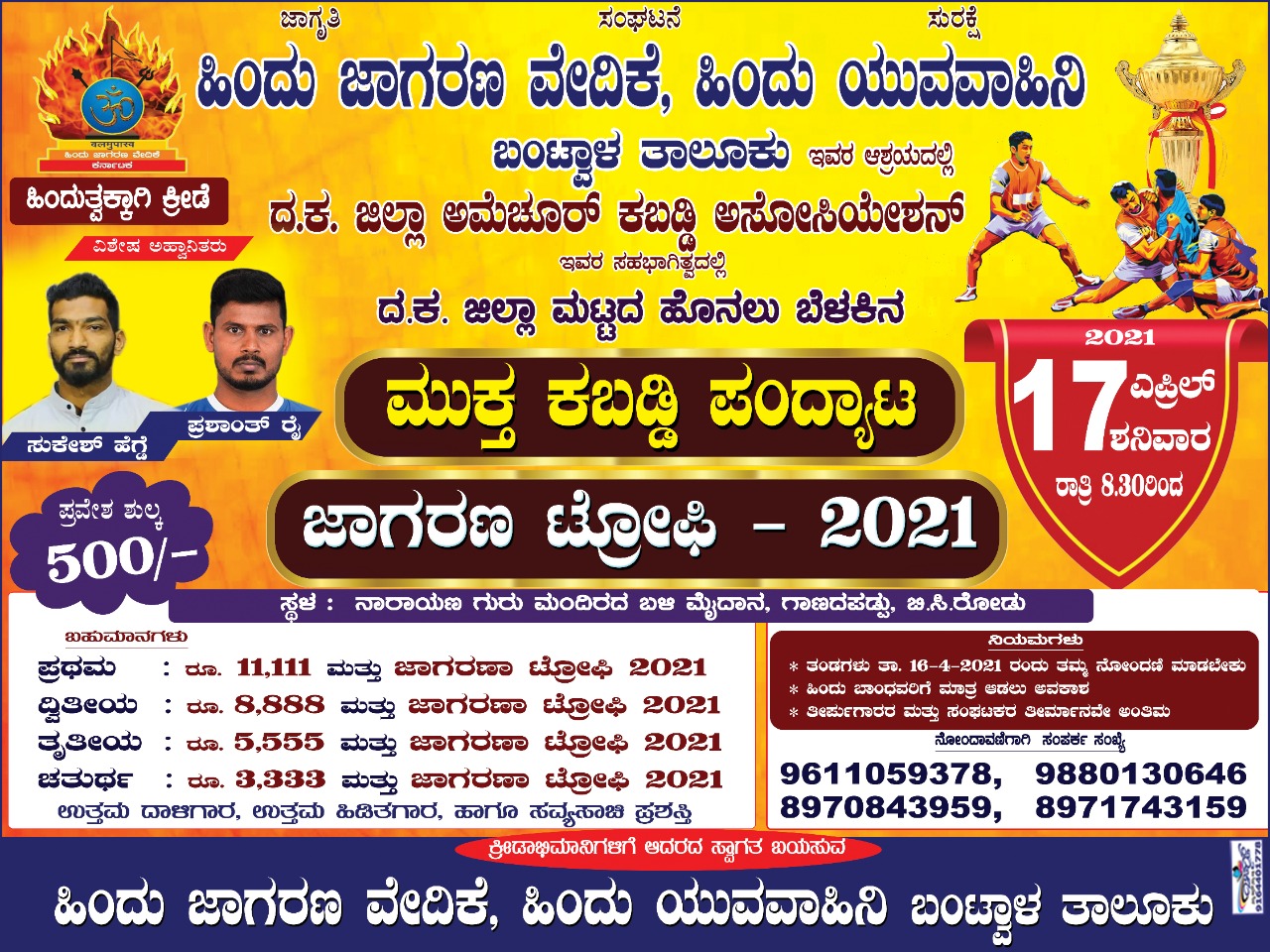 ಎಪ್ರಿಲ್ 17 ರಂದು ನಾರಾಯಣ ಗುರು ಮಂದಿರದ ಬಳಿ ಮೈದಾನ ಬಿ.ಸಿ.ರೋಡ್ ನಲ್ಲಿ ದ.ಕ. ಜಿಲ್ಲಾ ಮಟ್ಟದ ಹೊನಲು ಬೆಳಕಿನ ಮುಕ್ತ ಕಬ್ಬಡ್ಡಿ ಪಂದ್ಯಾಟ ಜಾಗರಣ ಟ್ರೋಫಿ-2021-ಕಹಳೆ ನ್ಯೂಸ್