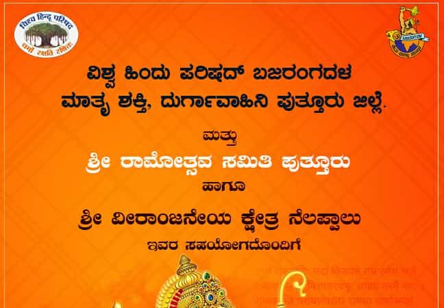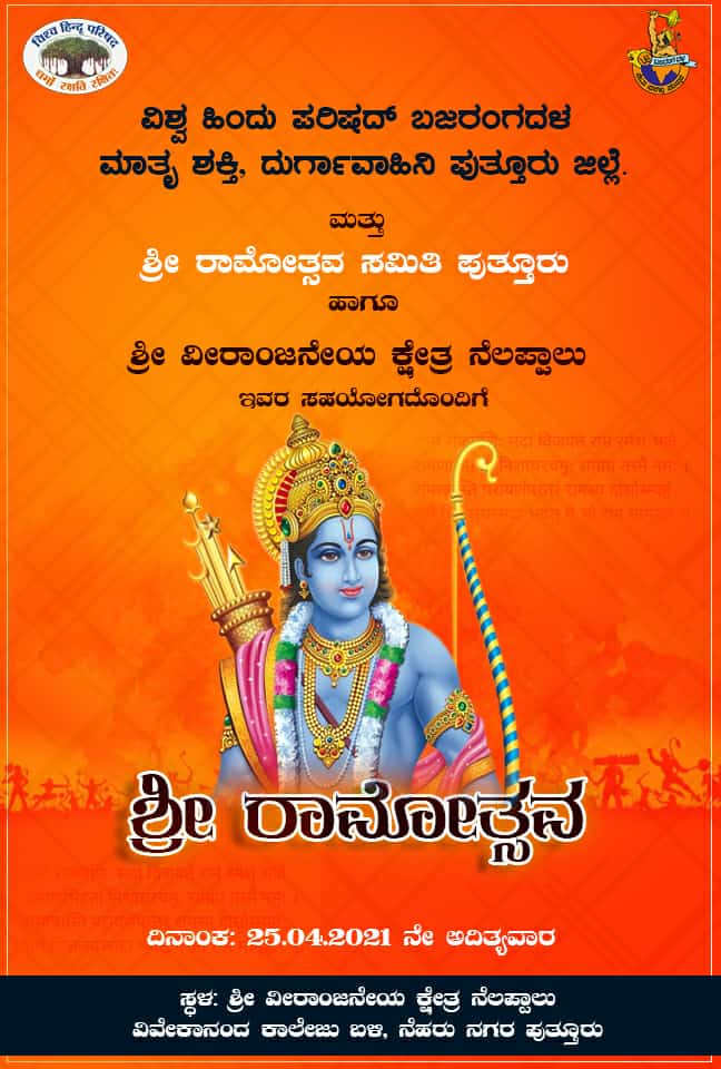 ಪುತ್ತೂರು : ವಿಶ್ವ ಹಿಂದು ಪರಿಷದ್ ಬಜರಂಗದಳ ಮಾತೃ ಶಕ್ತಿ, ದುರ್ಗಾವಾಹಿನಿ ಪುತ್ತೂರು ಜಿಲ್ಲೆ ಮತ್ತು ಶ್ರೀ ರಾಮೋತ್ಸವ ಸಮಿತಿ ಪುತ್ತೂರು ಹಾಗೂ ಶ್ರೀ ವೀರಾಂಜನೇಯ ಕ್ಷೇತ್ರ ನೆಲಪ್ಪಾಲು ಇವರ ಸಹಯೋಗದೊಂದಿಗೆ ಎಪ್ರಿಲ್ 25ರಂದು ಶ್ರೀ ವೀರಾಂಜನೇಯ ಕ್ಷೇತ್ರ ನೆಲಪ್ಪಾಲು, ವಿವೇಕಾನಂದ ಕಾಲೇಜು ಬಳಿ, ನೆಹರು ನಗರ ಪುತ್ತೂರಿನಲ್ಲಿ ಶ್ರೀ ರಾಮೋತ್ಸವ ನಡೆಯಲಿದೆ.