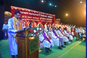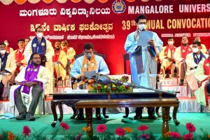 ಮಂಗಳೂರು ವಿಶ್ವವಿದ್ಯಾನಿಲಯದ ಮಂಗಳ ಸಭಾಂಗಣದಲ್ಲಿ ಶನಿವಾರ ನಡೆದ 39ನೇ ಘಟಿಕೋತ್ಸವದಲ್ಲಿ ಮನದ ಮಾತಿಗೆ ಕಾಗದದ ಹಂಗೇಕೆ ಎಂದೇ ತಮ್ಮ ಪ್ರಧಾನ ಭಾಷಣ ಪ್ರಾರಂಭಿಸಿದ ಅವರು, ನಾವು ಜೀವನದಲ್ಲಿ ಶಾರ್ಟ್ ಕಟ್ ನ್ನು ನಂಬಲೇಬಾರದು. ಬದುಕಿನಲ್ಲಿ ಕಷ್ಟಗಳು ಇರಲೇಬೇಕು, ಅವೇ ನಮಗೆ ಪಾಠ ಕಲಿಸುತ್ತವೆ, ಯಶಸ್ಸಿನ ಮೆಟ್ಟಿಲುಗಳಾಗುತ್ತವೆ ಎಂದು ತಮ್ಮ ಬದುಕನ್ನೇ ಉದಾಹರಣೆಯಾಗಿ ವಿವರಿಸಿದರು. ಇದೇ ವೇಳೆ ಕರಾವಳಿಗರು ಕಠಿಣ ಪರಿಶ್ರಮಿಗಳು ಎನ್ನಲು ಅವರು ಮರೆಯಲಿಲ್ಲ.
