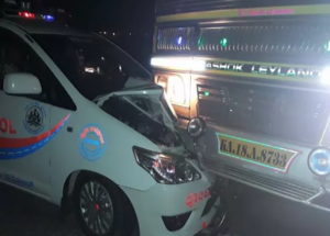 ಬೆಂಗಾವಲು ಕಾರು ಸಂಪೂರ್ಣ ನಜ್ಜುಗುಜ್ಜಾಗಿದ್ದು, ಅದ್ರಲ್ಲಿದ್ದ ಎಎಸ್ಐ ಪ್ರಭು ತಳವಾರ ಕಾಲಿಗೆ ಗಾಯವಾಗಿದೆ. ಕೂಡಲೇ ಬೆಂಗಾವಲು ಸಿಬ್ಬಂದಿ, ಪರಾರಿ ಆಗ್ತಿದ್ದ ಲಾರಿ ಚಾಲಕನನ್ನ ಹಿಡಿದು ಪೊಲೀಸರಿಗೆ ಒಪ್ಪಿಸಿದ್ದಾರೆ. ಲಾರಿ ಚಾಲಕನನ್ನ ನಾಸೀರ್ ಎಂದು ಗುರುತಿಸಿದ್ದು, ಪೊಲೀಸರು ವಿಚಾರಣೆ ನಡೆಸಿದ್ದಾರೆ.
