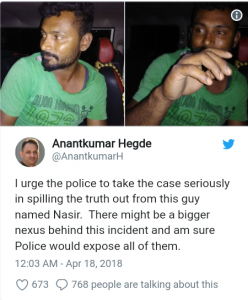 ಕೇಂದ್ರ ಸಚಿವ ಅನಂತ್ ಕುಮಾರ್ ಹೆಗಡೆ ಟ್ವಿಟ್ಟರ್ನಲ್ಲಿ ಆರೋಪಿಸಿರುವ ಪ್ರಕಾರ, ಇದು ಹತ್ಯಾ ಯತ್ನ. ತಮ್ಮ ಬರುವಿಕೆಗಾಗಿಯೇ ರಾಂಗ್ ಸೈಡ್ನಲ್ಲಿ ಲಾರಿಯನ್ನು ನಿಲ್ಲಿಸಿಕೊಳ್ಳಲಾಗಿತ್ತು. ತಾವಿದ್ದ ಕಾರುಗಳು ಬರುತ್ತಿದ್ದಂತೆ ಲಾರಿ ಚಾಲಕ ಉದ್ದೇಶವಪೂರ್ವಕವಾಗಿ ತಮ್ಮ ಮೇಲೆ ಹರಿಸಲು ನೋಡಿದ. ಆದ್ರೆ ಅದೃಷ್ಟವಶಾತ್ ಅಪಾಯದಿಂದ ಪಾರಾಗಿದ್ದೇನೆ. ಈ ಬಗ್ಗೆ ಪೊಲೀಸರು ಸೂಕ್ತ ರೀತಿಯಲ್ಲಿ ವಿಚಾರಣೆ ಕೈಗೊಂಡು, ಸತ್ಯ ಬಯಲುಮಾಡಬೇಕು ಎಂದು ಸಚಿವರು ಆಗ್ರಹಿಸಿದ್ದಾರೆ. ಇನ್ನು ಸಚಿವರ ಪಿಎ ಕೂಡ ಇದೇ ಅರ್ಥದ ಮಾತುಗಳನ್ನ ಆಡಿದ್ದಾರೆ.