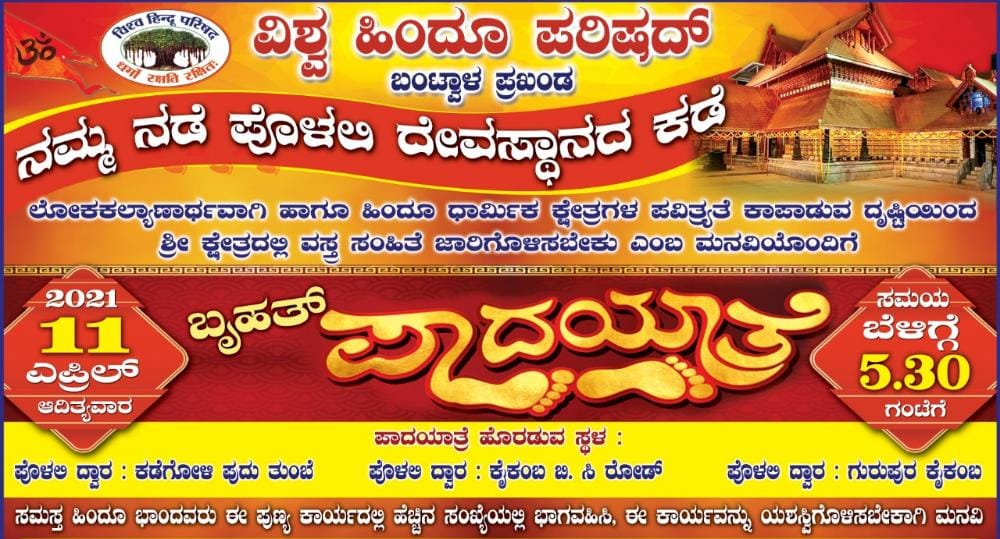 ವಿಶ್ವಹಿಂದು ಪರಿಷದ್ ಬಜರಂಗದಳ ಬಂಟ್ವಾಳ ಪ್ರಖಂಡ “ನಮ್ಮ ನಡೆ ಪೊಳಲಿ ದೇವಸ್ಥಾನದ ಕಡೆ” ಬ್ರಹತ್ ಪಾದಯಾತ್ರೆ-ಕಹಳೆ ನ್ಯೂಸ್