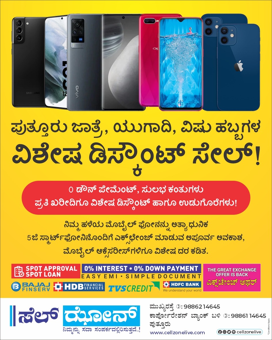 ಪುತ್ತೂರಿನ ಶ್ರೀ ವೆಂಕಟರಮಣ ದೇವಸ್ಥಾನ ಮತ್ತು ಕಾರ್ಪೋರೇಷನ್ ಬ್ಯಾಂಕ್ ಬಳಿ ಇರುವ ‘ಸೆಲ್ಝೋನ್ ಮೊಬೈಲ್ ಸರ್ವಿಸ್ & ಸರ್ವಿಸ್ ಮಳಿಗೆ’ ಯಾವುದೇ ಸ್ಥಿತಿಯಲ್ಲಿರುವ ನಿಮ್ಮ ಹಳೆಯ ಮೊಬೈಲ್ಗಳನ್ನು ಅತ್ಯಾಧುನಿಕ 5ಜಿ ಸ್ಮಾರ್ಟ್ ಫೋನಿನೊಂದಿಗೆ ಎಕ್ಸ್ ಚೇಂಜ್ ಮಾಡುವ ಅವಕಾಶವನ್ನು ನೀಡುತ್ತಿದೆ. ಜೊತೆಗೆ ವಿಶೇಷ ಡಿಸ್ಕೌಂಟ್ ಸೇಲ್ ಏರ್ಪಡಿಸಿದ್ದಾರೆ. 0% ಡೌನ್ ಪೇಮೆಂಟ್ನೊಂದಿಗೆ ಸ್ಮಾರ್ಟ್ಫೋನ್ ಖರೀದಿಸುವ ಅವಕಾಶ ಹಾಗೂ ಮೊಬೈಲ್ ಆಕ್ಸೆಸರಿಗಳಿಗೂ ವಿಶೇಷವಾದ ರಿಯಾಯಿತಿ ನೀಡುತ್ತಿದೆ. ಕನಿಷ್ಠ ದಾಖಲೆ ಪತ್ರದೊಂದಿಗೆ 0% ಬಡ್ಡಿದರದಲ್ಲಿ ಸ್ಥಳದಲ್ಲೇ ಸಾಲ ಸೌಲಭ್ಯವನ್ನು ನೀಡುತ್ತಿದೆ.