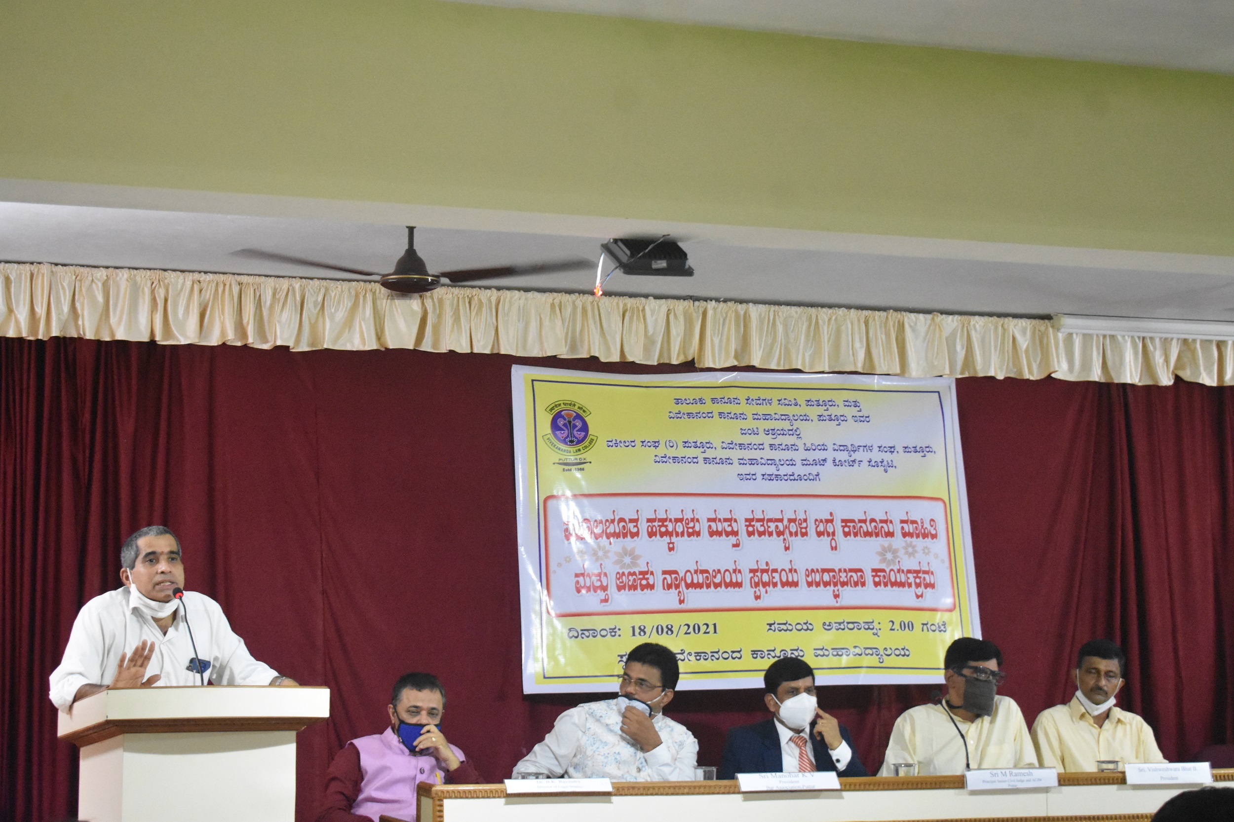 ವಿವೇಕಾನಂದ ಕಾನೂನು ವಿದ್ಯಾಲಯದಲ್ಲಿ ತಾಲೂಕು ಕಾನೂನು ಸೇವೆಗಳ ಸಮಿತಿ ಪುತ್ತೂರು ಇವರ ಜಂಟಿ ಆಶ್ರಯದಲ್ಲಿ ವಕೀಲರ ಸಂಘ ಪುತ್ತೂರು(ರಿ), ವಿವೇಕಾನಂದ ಕಾನೂನು ಮಹಾ ವಿದ್ಯಾಲಯ ಹಿರಿಯ ವಿದ್ಯಾರ್ಥಿಗಳ ಸಂಘ ಮತ್ತು ವಿವೇಕಾನಂದ ಕಾನೂನು ಮಹಾವಿದ್ಯಾಲಯ ಮೂಟ್ ಕೋರ್ಟ್ ಸೊಸೈಟಿ ಇವರ ಸಹಕಾರದೊಂದಿಗೆ ಮೂಲಭೂತ ಹಕ್ಕುಗಳು ಮತ್ತು ಕರ್ತವ್ಯಗಳ ಬಗ್ಗೆ ಕಾನೂನು ಮಾಹಿತಿ ಮತ್ತು ಅಣಕು ನ್ಯಾಯಾಲಯ ಸ್ಪರ್ಧೆ ವಿವೇಕಾನಂದ ಕಾನೂನು ವಿದ್ಯಾಲಯದಲ್ಲಿ ನಡೆಯಿತು. ಕಾರ್ಯಕ್ರಮವನ್ನು ಶ್ರೀ ಎಂ.ರಮೇಶ್, ಗೌರವಾನ್ವಿತ ಪ್ರಧಾನ ಹಿರಿಯ ವ್ಯವಹಾರಿಕ ನ್ಯಾಯಾಧೀಶರು ಮತ್ತು ಹೆಚ್ಚುವರಿ ಮುಖ್ಯ ನ್ಯಾಯಿಕ ದಂಡಾಧಿಕಾರಿಯವರು ಹಾಗೂ ಅಧ್ಯಕ್ಷರು, ತಾಲೂಕು ಕಾನೂನು ಸೇವೆಗಳ ಸಮಿತಿ ಪುತ್ತೂರು ಇವರು ದೀಪ ಬೆಳಗಿಸುವ ಉದ್ಘಾಟಿಸಿದರು. ಬಳಿಕ ಮಾತನಾಡಿದ ಶ್ರೀ ಎಂ ರಮೇಶ್ ಇವರು, ವಿದ್ಯಾರ್ಥಿಗಳು ತಾವು ಅರಿತುಕೊಳ್ಳಬೇಕಾದ ವಿಷಯಗಳನ್ನು ಮರೆತು ಶೂನ್ಯವಾಗಿ ಕುಳಿತುಕೊಳ್ಳದೆ, ಕರ್ತವ್ಯನಿರತರಾಗಿ, ಸಮಾಜಕ್ಕೆ ಭವಿಷ್ಯದಲ್ಲಿ ತಾವು ಕೊಡಬೇಕಾದ ಕೊಡುಗೆಗಳ ಬಗ್ಗೆ ಗಮನ ಹರಿಸಬೇಕು. ವಿದ್ಯಾರ್ಥಿ ದಿಸೆಯಿಂದಲೇ ಕಾನೂನು ವಿದ್ಯಾರ್ಥಿಗಳು ಸ್ಪರ್ಧಾತ್ಮಕ ಪರೀಕ್ಷೆಗಳ ತಯಾರಿಯಲ್ಲಿ ತೊಡಗಿಸಿಕೊಂಡರೆ ಒಳ್ಳೆಯದು. ಹೆಚ್ಚೆಚ್ಚು ಮಂದಿ ನ್ಯಾಯಾಧೀಶ ಹುದ್ದೆಗಳತ್ತ ದೃಷ್ಟಿ ಹರಿಸಬೇಕು. ವಿದ್ಯಾರ್ಥಿಗಳು ವಿವೇಚನೆ, ದೂರದರ್ಶಿತ್ವದಂತಹ ಗುಣಗಳನ್ನು ತಮ್ಮಲ್ಲಿ ಬೆಳೆಸಿಕ್ಕೊಳ್ಳಬೇಕು. ನಿರಂತರ ಪರಿಶ್ರಮ, ಶ್ರದ್ಧೆಯ ಮೂಲಕ ಗುರಿ ಮುಟ್ಟಬಹುದು. ಪ್ರತಿಯೊಬ್ಬರಿಗೂ ತಮ್ಮದೇ ಆದ ಕನಸುಗಳಿರುತ್ತವೆ. ಸಾಧಿಸಬೇಕೆಂಬ ಛಲವುಳ್ಳ, ಗಮ್ಯದೆಡೆಗೆ ಸಾಗುವ ವಿದ್ಯಾಥಿಗಳಿಗೆ ಸದಾ ತಮ್ಮ ಪ್ರೋತ್ಸಾಹ, ಬೆಂಬಲವಿದೆಯೆನ್ನುತ್ತಾ ಬದುಕಿನಲ್ಲಿ ಒಳನೋಟ, ಅರಿವು, ಸ್ಪಷ್ಟತೆ ಎಷ್ಟು ಮುಖ್ಯ ಎಂಬುದನ್ನು ಪ್ರಾಯೋಗಿಕವಾಗಿ ಉದಾಹರಣೆಯೊಂದಿಗೆ ತಿಳಿಸಿದರು.