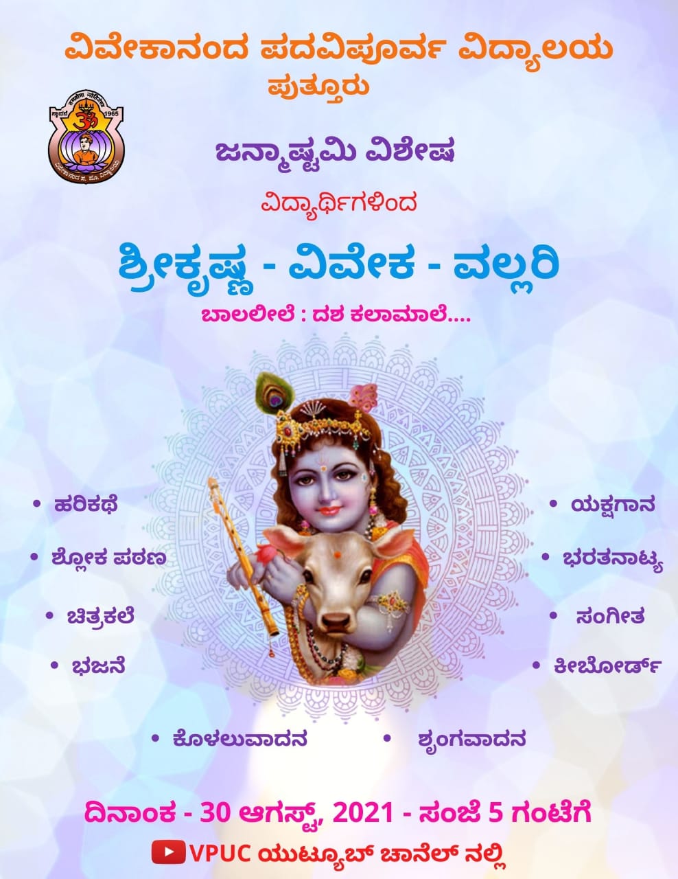 ವಿವೇಕಾನಂದ ಪದವಿಪೂರ್ವ ಕಾಲೇಜಿನ ವಿದ್ಯಾರ್ಥಿಗಳು ಮತ್ತು ಉಪನ್ಯಾಸಕರಿಂದ ವಿನೂತನ ಪ್ರಯತ್ನ: ಶ್ರೀಕೃಷ್ಣ ವಿವೇಕ ವಲ್ಲರಿ-ಬಾಲಲೀಲೆ ದಶಕಲಾಮಾಲೆ ಸಾಂಸ್ಕೃತಿಕ ವೈವಿಧ್ಯ ಕಾರ್ಯಕ್ರಮ- ಕಹಳೆ ನ್ಯೂಸ್