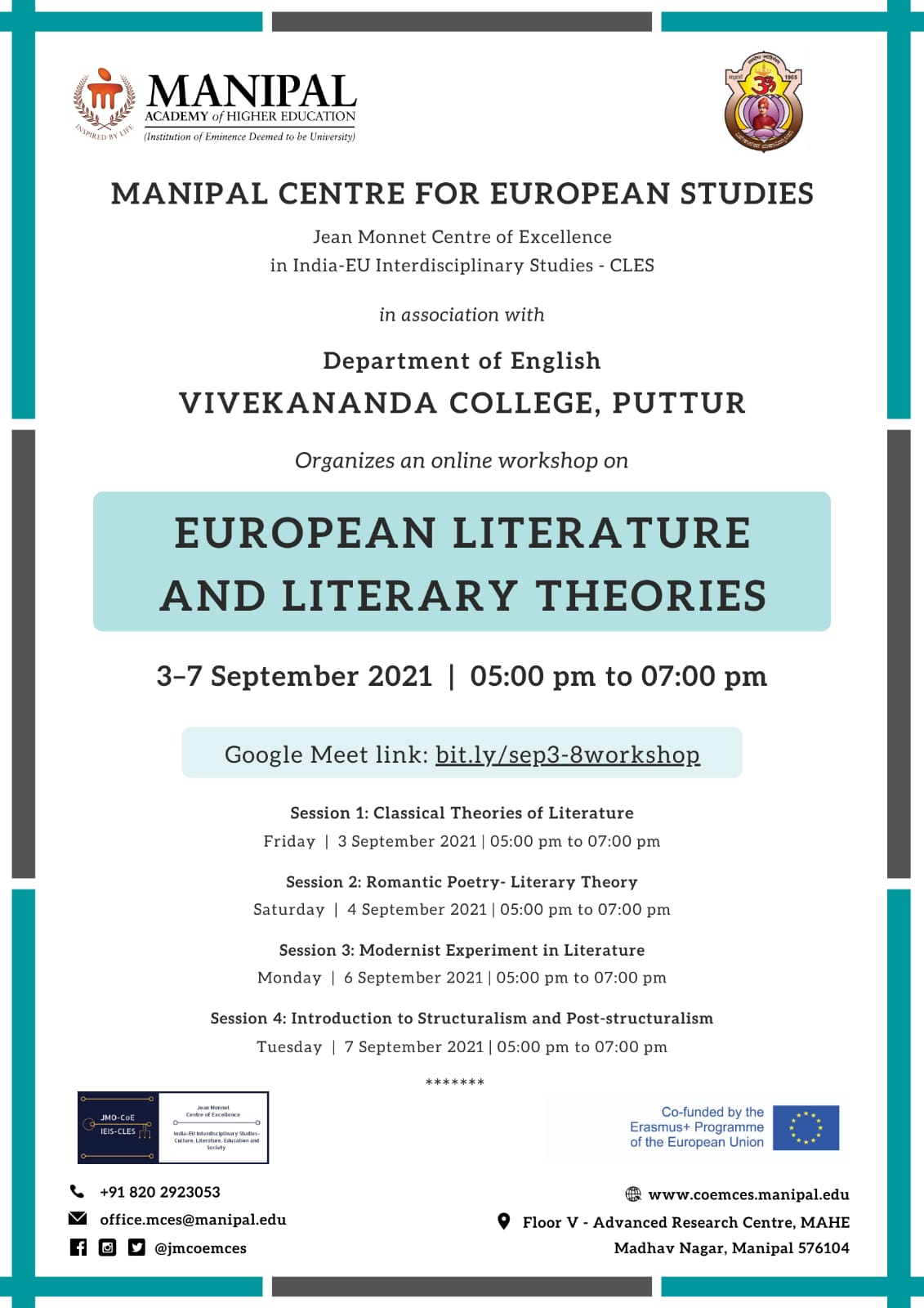 ಪುತ್ತೂರು: ವಿವೇಕಾನಂದ ಮಹಾವಿದ್ಯಾಲಯದ ಆಂಗ್ಲ ವಿಭಾಗ ಮತ್ತು ಲಿಟರರಿ ಕ್ಲಬ್ ಹಾಗೂ ಮಣಿಪಾಲ ವಿಶ್ವವಿದ್ಯಾನಿಲಯದ ಜಂಟಿ ಆಶ್ರಯದಲ್ಲಿ ‘ಯುರೋಪಿಯನ್ ಲಿಟರೇಚರ್ ಮತ್ತು ಲಿಟರರಿ ತಿಯರೀಸ್’ ಎಂಬ ವಿಷಯದ ಕುರಿತು ನಾಲ್ಕು ದಿನಗಳ ವರ್ಚುವಲ್ ಕಾರ್ಯಾಗಾರವು ಸಪ್ಟೆಂಬರ್ 3 ರಿಂದ 7 ರವರೆಗೆ ನಡೆಯಿತು.