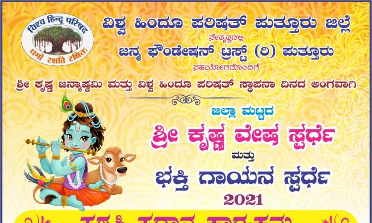 ಪುತ್ತೂರು: ವಿಶ್ವ ಹಿಂದೂ ಪರಿಷದ್ ಪುತ್ತೂರು ಜಿಲ್ಲೆ ನೇತೃತ್ವದಲ್ಲಿ ಜನ್ಮ ಫೌಂಡೇಶನ್ ಟ್ರಸ್ಟ್(ರಿ.) ಪುತ್ತೂರು ಸಹಯೋಗದೊಂದಿಗೆ ಶ್ರೀ ಕೃಷ್ಣ ಜನ್ಮಾಷ್ಠಮಿಯ ಮತ್ತು ವಿಶ್ವ ಹಿಂದೂ ಪರಿಷದ್ ನ ಸ್ಥಾಪನಾ ದಿನದ ಅಂಗವಾಗಿ ನಡೆದ ಜಿಲ್ಲಾ ಮಟ್ಟದ ಶ್ರೀ ಕೃಷ್ಣ ವೇಷ ಸ್ಪರ್ಧೆ ಮತ್ತು ಭಕ್ತಿ ಗಾಯನ ಸ್ಪರ್ಧೆ 2021 ರ ಪ್ರಶಸ್ತಿ ಪ್ರಧಾನ ಕಾರ್ಯಕ್ರಮವೂ ಸೆ.14 ರಂದು ಮಹಾಲಿಂಗೇಶ್ವರ ದೇವಸ್ಥಾನದ ನಟರಾಜ ವೇದಿಕೆಯಲ್ಲಿ ನಡೆಯಲಿದೆ.