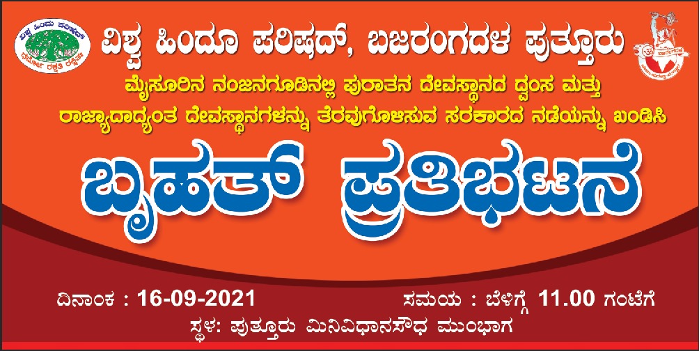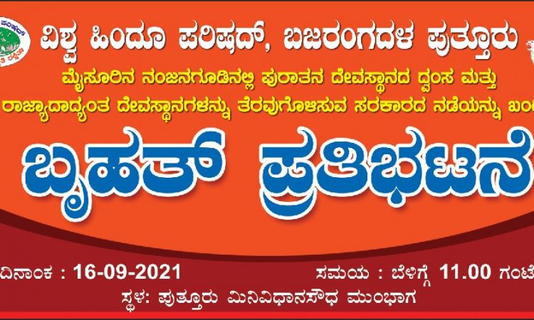 ಮೈಸೂರಿನ ನಂಜನಗೂಡಿನಲ್ಲಿ ಪುರಾತನ ದೇವಸ್ಥಾನದ ದ್ವಂಸ ಮತ್ತು ರಾಜ್ಯಾದದ್ಯಂತ ಅನಧಿಕೃತ ದೇವಸ್ಥಾನಗಳನ್ನು ತೆರವುಗೊಳಿಸುವ ಸರಕಾರದ ನಡೆಯನ್ನು ಖಂಡಿಸಿ ಪುತ್ತೂರು ವಿಶ್ವ ಹಿಂದೂ ಪರಿಷದ್ ಹಾಗೂ ಬಜರಂಗದಳದ ವತಿಯಿಂದ ನಾಳೆ ಬೃಹತ್ ಪ್ರತಿಭಟನೆ ಪುತ್ತೂರು ಮಿನಿವಿಧಾನಸೌದ ಮುಂಭಾಗ ನಡೆಯಲಿದೆ.
