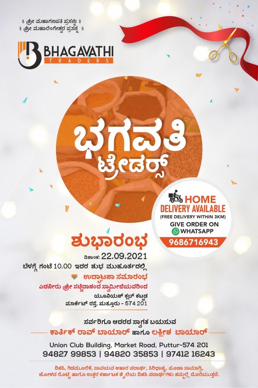 ಪುತ್ತೂರಿನ ಮಾರ್ಕೆಟ್ ರಸ್ತೆಯ ಯೂನಿಯನ್ ಕ್ಲಬ್ ಕಟ್ಟಡದಲ್ಲಿ ನಾಳೆ ಸೆಪ್ಟೆಂಬರ್ 22ರಂದು ನೂತನ ‘ಭಗವತಿ ಟ್ರೇಡರ್ಸ್’ ಶುಭಾರಂಭ- ಕಹಳೆ ನ್ಯೂಸ್