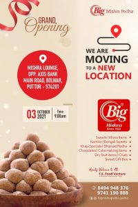ಪುತ್ತೂರು: ಕೆಎಸ್ಆರ್ಟಿಸಿ ಬಸ್ ನಿಲ್ದಾಣ ಮುಂಭಾಗದ ವಿ.ಎಂ. ಕಾಂಪ್ಲೆಕ್ಸ್ ನಲ್ಲಿ ಕಾರ್ಯನಿರ್ವಹಿಸುತ್ತಿದ್ದ “ಬಿಗ್ ಮಿಶ್ರಾ ಫೆಡಾ’ ಇದೀಗ ಬೊಳುವಾರು ಮುಖ್ಯರಸ್ತೆಯ ಆಕ್ಸಿಸ್ ಬ್ಯಾಂಕ್ ಮುಂಭಾಗದಲ್ಲಿ ಸ್ಥಳಾಂತರಗೊ0ಡು ಅಕ್ಟೋಬರ್ 3 ರಂದು ಶುಭಾರಂಭಗೊಳ್ಳಲಿದೆ. ಬೇರೆ-ಬೇರೆ ಜಿಲ್ಲೆಗಳ ಫೇಮಸ್ ಸ್ವೀಟ್ಸ್ ಒಂದೇ ಮಳಿಗೆಯಡಿ ಜನರಿಗೆ ನೀಡಿ, ಜನರ ವಿಶ್ವಾಸಗಳಿಸಿದ, “ಬಿಗ್ ಮಿಶ್ರಾ ಫೆಡಾ’ ಸಂಸ್ಥೆ ಗ್ರಾಹಕರಿಗೆ ಉತ್ತಮ ಮಟ್ಟದ ಸೇವೆ ನೀಡಲು ಸಿದ್ಧವಾಗಿದೆ.