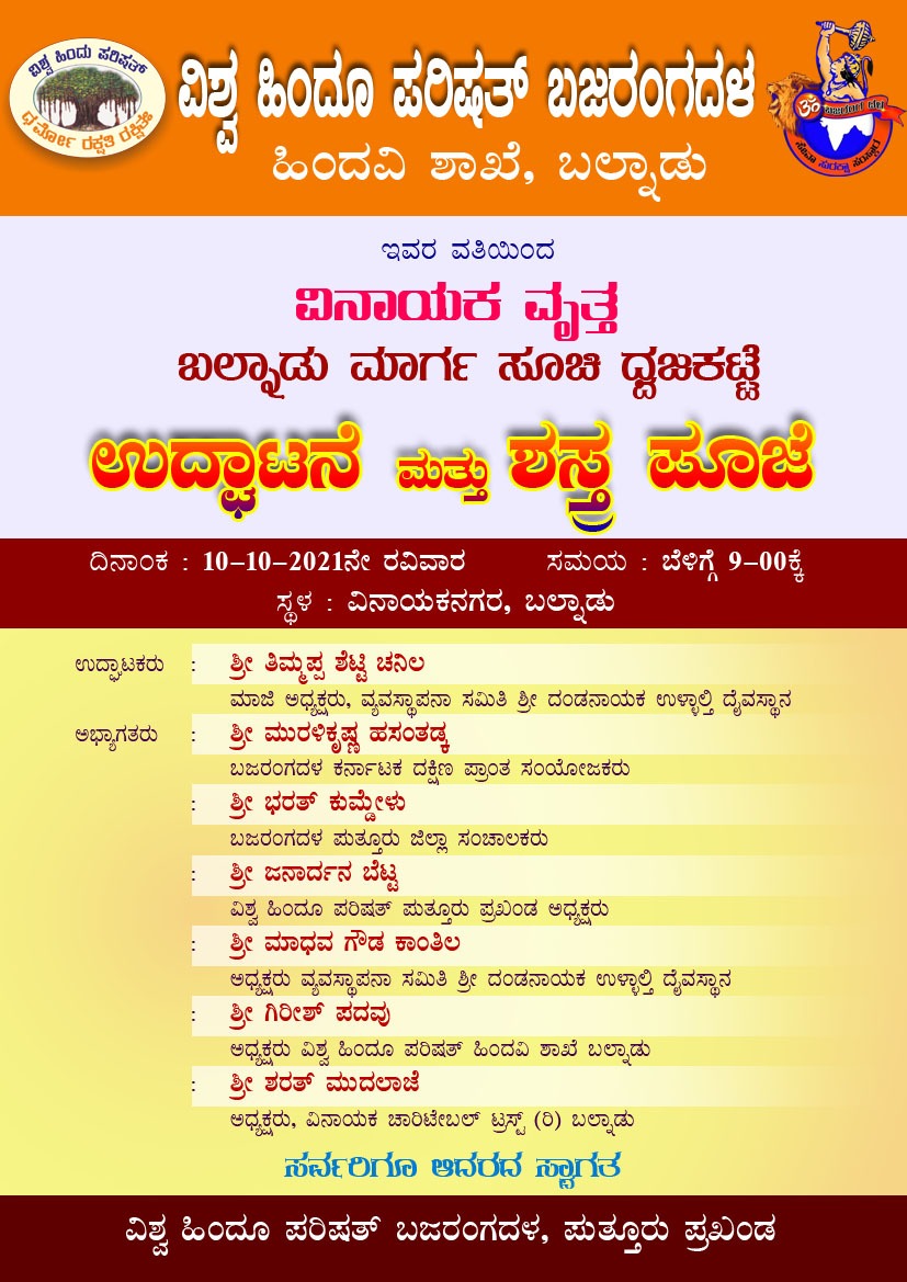 ವಿಶ್ವ ಹಿಂದೂ ಪರಿಷತ್ ಬಜರಂಗದಳ ಹಿಂದವಿ ಶಾಖೆ ವತಿಯಿಂದ ಅ.10ರಂದು ಬಲ್ನಾಡು ವಿನಾಯಕ ವೃತ್ತದ ಮಾರ್ಗಸೂಚಿ ದ್ವಜಕಟ್ಟೆಯ ಉದ್ಘಾಟನೆ ಮತ್ತು ಶಸ್ತ್ರ ಪೂಜೆ ಕಾರ್ಯಕ್ರಮ- ಕಹಳೆ ನ್ಯೂಸ್