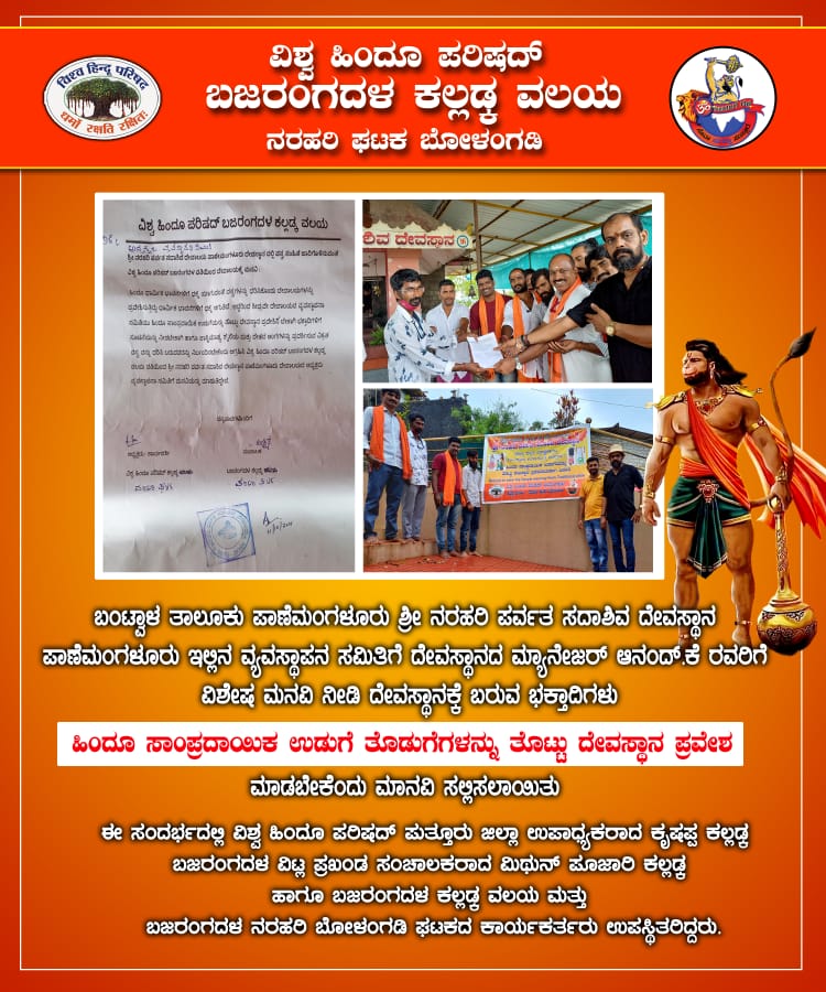 ಶ್ರೀ ನರಹರಿ ಪರ್ವತ ಸದಾಶಿವ ದೇವಸ್ಥಾನದಲ್ಲಿ ವಸ್ತ್ರಸಂಹಿತೆ ಜಾರಿ ಮಾಡುವಂತೆ ವಿಶ್ವ ಹಿಂದೂ ಪರಿಷದ್ ವತಿಯಿಂದ ಮನವಿ – ಕಹಳೆ ನ್ಯೂಸ್
