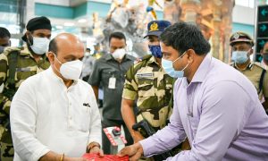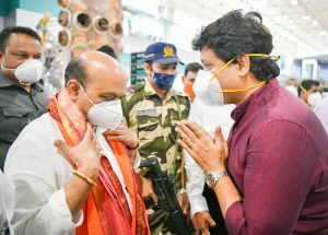 ಮಂಗಳೂರು : ಉಡುಪಿ ಜಿಲ್ಲೆಯಲ್ಲಿ ವಿವಿಧ ಕಾರ್ಯಕ್ರಮಗಳು ಹಾಗೂ ಮಂಗಳೂರಿನ ಕುದ್ರೋಳಿ ದೇವಸ್ಥಾನದ ದಸರಾ ಕಾರ್ಯಕ್ರಮದಲ್ಲಿ ಭಾಗವಹಿಸಲು ರಾಜ್ಯದ ಮುಖ್ಯಮಂತ್ರಿಗಳಾದ ಬಸವರಾಜ್ ಬೊಮ್ಮಾಯಿ ಅವರು ಅಕ್ಟೋಬರ್ ೧೩ರ ಬುಧವಾರ ಮಂಗಳೂರು ಅಂತರಾಷ್ಟ್ರೀಯ ವಿಮಾನ ನಿಲ್ದಾಣಕ್ಕೆ ಬಂದಿಳಿದರು. ಈ ಸಂದರ್ಭದಲ್ಲಿ ಜಿಲ್ಲಾಡಳಿತದ ವತಿಯಿಂದ ಅವರನ್ನು ಆತ್ಮೀಯವಾಗಿ ಸ್ವಾಗತಿಸಲಾಯಿತು.