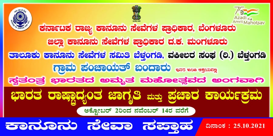 ಬಂದಾರು: ಕರ್ನಾಟಕ ರಾಜ್ಯ ಕಾನೂನು ಸೇವೆಗಳ ಪ್ರಾಧಿಕಾರ,ಬೆಂಗಳೂರು, ಜಿಲ್ಲಾ ಕಾನೂನು ಸೇವೆಗಳ ಪ್ರಾಧಿಕಾರ ದ.ಕ.ಮಂಗಳೂರು, ತಾಲೂಕು ಕಾನೂನು ಸೇವೆಗಳ ಸಮಿತಿ ಬೆಳ್ತಂಗಡಿ, ವಕೀಲರ ಸಂಘ (ರಿ.) ಬೆಳ್ತಂಗಡಿ,