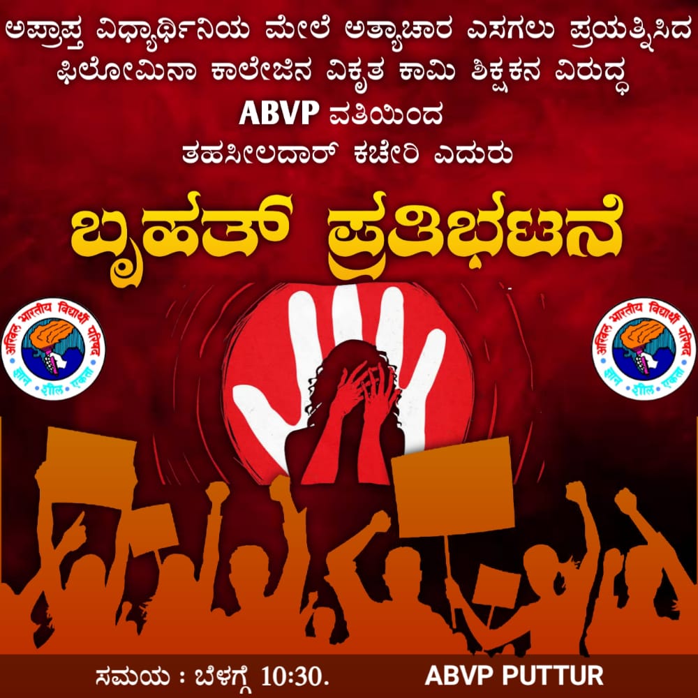 ” ಅಪ್ರಾಪ್ತ ವಿದ್ಯಾರ್ಥಿನಿಯ ಮೇಲೆ ಅತ್ಯಾಚಾರ ಎಸಗಲು ಪ್ರಯತ್ನಿಸಿದ ಫಿಲೋಮಿನಾ ಕಾಲೇಜಿನ ವಿಕೃತ ಕಾಮಿ ಶಿಕ್ಷಕನ ವಿರುದ್ಧ ABVP ವತಿಯಿಂದ ತಹಸೀಲದಾರ್ ಕಚೇರಿ ಎದುರು ಬೃಹತ್ ಪ್ರತಿಭಟನೆ ” – ಎಂದು ಪ್ರಕಟಣೆಯಲ್ಲಿ ಬರೆಯಲಾಗಿದೆ.