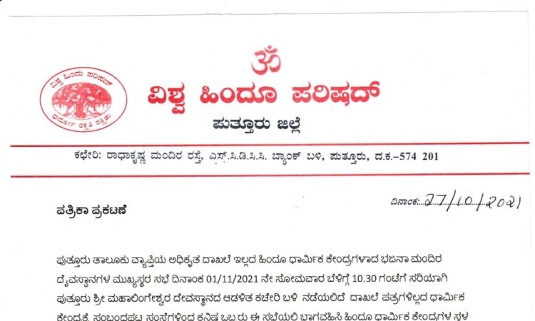 ದಾಖಲೆ ಪತ್ರಗಳಿಲ್ಲದ ಧಾರ್ಮಿಕ ಕೇಂದ್ರಕ್ಕೆ ಸಂಬಂಧಪಟ್ಟ ಸಂಸ್ಥೆಗಳಿಂದ ಕನಿಷ್ಠ ಒಬ್ಬರು ಈ ಸಭೆಯಲ್ಲಿ ಭಾಗವಹಿಸುವಂತೆ ವಿಶ್ವ ಹಿಂದೂ ಪರಿಷತ್ ಪುತ್ತೂರು ಜಿಲ್ಲಾ ಕಾರ್ಯದರ್ಶಿ ಸತೀಶ್ ಬಿ ಎಸ್ ಹಾಗೂ ಜಿಲ್ಲಾ ಧಾರ್ಮಿಕ ಪರಿಷತ್ ಸದಸ್ಯರು, ಬಜರಂಗದಳ ಪ್ರಾಂತ ಸಹ ಸಂಚಾಲಕರು ಆದ ಮುರಳಿಕೃಷ್ಣ ಹಸಂತಡ್ಕ ಮನವಿ ಮಾಡಿದ್ದಾರೆ.