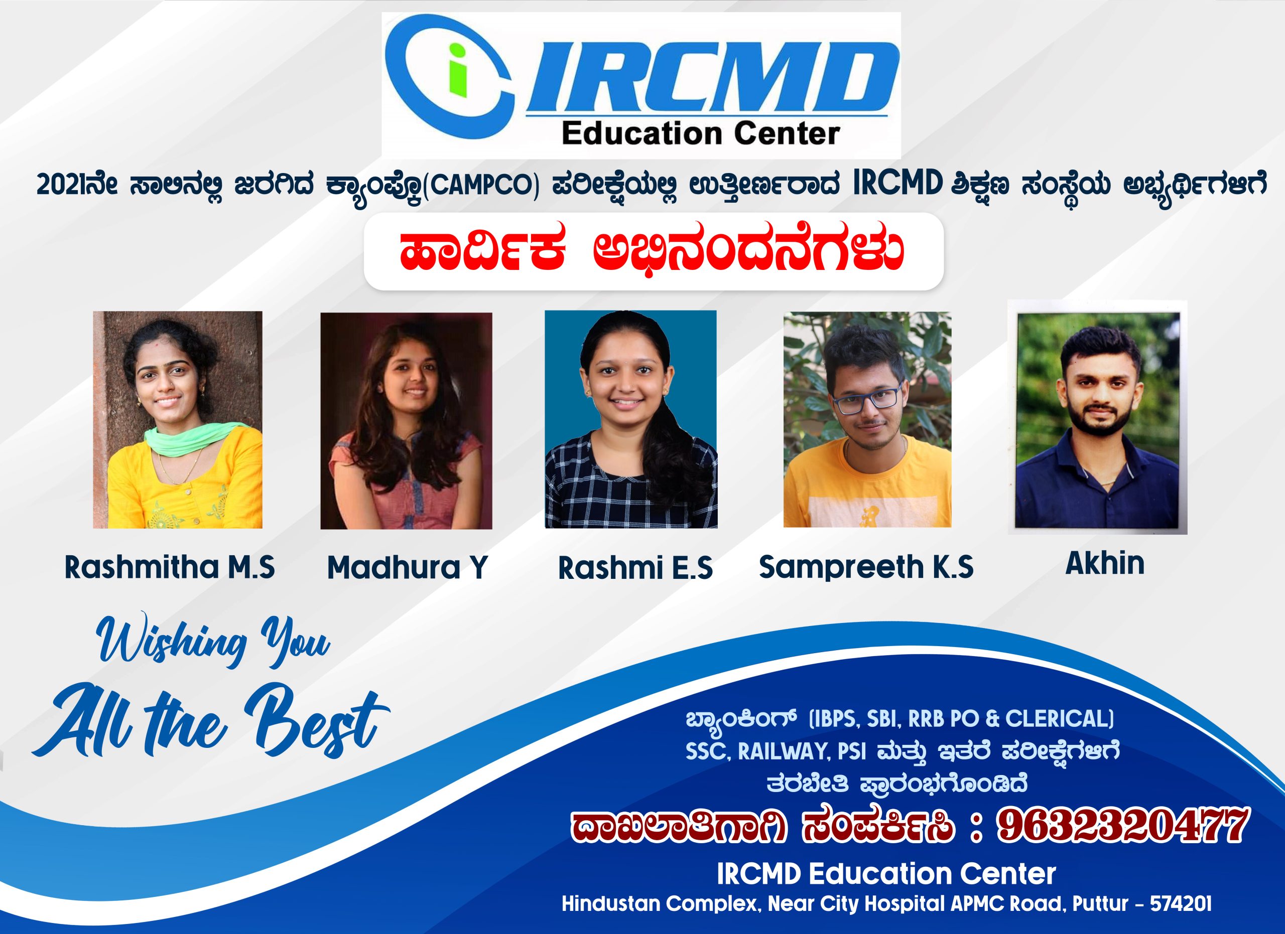 ಪುತ್ತೂರು ಎಪಿಎಂಸಿ ರಸ್ತೆಯಲ್ಲಿ 2010ರಿಂದ ಕಾರ್ಯಾಚಾರಿಸುತ್ತಿರುವ ಬ್ಯಾಂಕಿಂಗ್ ಪರೀಕ್ಷಾ ತರಬೇತಿ ಮತ್ತು ಕಂಪ್ಯೂಟರ್ ತರಬೇತಿಗೆ ಹೆಸರಾದ ಐ.ಆರ್.ಸಿಎಂಡಿ ಶಿಕ್ಷಣ ಸಂಸ್ಥೆಯಲ್ಲಿ ತರಬೇತಿ ಪಡೆದ 5 ವಿದ್ಯಾರ್ಥಿಗಳು 2021ನೇ ಸಾಲಿನ ಕ್ಯಾಂಪ್ಕೋ ನೇಮಕಾತಿ ಪರೀಕ್ಷೆಯಲ್ಲಿ ಉತ್ತೀರ್ಣರಾಗಿದ್ದಾರೆ. ಕು.ರಶ್ಮಿತಾ ಎಂ.ಎಸ್, ಕು.ರಶ್ಮಿ ಇ, ಕು.ಮಧುರಾ ವೈ, ಸಂಪ್ರೀತ್ ಕೆ.ಎಸ್, ಅಖಿನ್ ಕೋಟ್ಯಾನ್ ತೇರ್ಗಡೆಗೊಂಡು ಸಂದರ್ಶನಕ್ಕೆ ಆಯ್ಕೆಯಾಗಿದ್ದಾರೆ.2010 ರಿಂದ ಸಾವಿರಾರು ಉದ್ಯೋಗಾಕಾಂಕ್ಷಿಗಳ ಕನಸನ್ನು ನನಸಾಗಿಸುವ ನಿಟ್ಟಿನಿಂದ ಸ್ಥಾಪನೆಗೊಂಡ ಪುತ್ತೂರಿನ ಏಕೈಕ ತರಬೇತಿ ಸಂಸ್ಥೆ ಎಂಬ ಹೆಗ್ಗಳಿಕೆಗೆ ಪಾತ್ರವಾಗಿದ್ದು, ಪ್ರತಿ ವಿದ್ಯಾರ್ಥಿಯನ್ನು ಉದ್ಯೋಗದತ್ತ ಕೊಂಡೊಯ್ಯುವುದೇ ಐಆರ್ ಸಿಎಂಡಿ ಶಿಕ್ಷಣ ಸಂಸ್ಥೆಯ ಮುಖ್ಯ ಧೈಯವಾಗಿದೆ.12ನೇ ವಾರ್ಷಿಕೋತ್ಸವದ ಪ್ರಯುಕ್ತ ಸಂಸ್ಥೆಯ ವಿದ್ಯಾರ್ಥಿಗಳಿಗೆ ಉಚಿತ ಬ್ಯಾಂಕಿಂಗ್ ಹಾಗೂ ಇತರೆ ಸ್ಪರ್ಧಾತ್ಮಕ ಪರೀಕ್ಷೆಗಳಿಗೆ ಉಚಿತ ತರಬೇತಿಯು ನೀಡಲಾಗುತ್ತಿದ್ದು ಆಸಕ್ತರು ಇದರ ಪ್ರಯೋಜನವನ್ನು ಪಡೆದುಕೊಳ್ಳಬೇಕಾಗಿ ಸಂಸ್ಥೆ ಪ್ರಕಟಿಸಿರುತ್ತದೆ. ಆಸಕ್ತರು ದೂರವಾಣಿ ಏ32320477 ಗೆ ಕರೆಮಾಡಿ ನೋಂದಾಯಿಸಿ