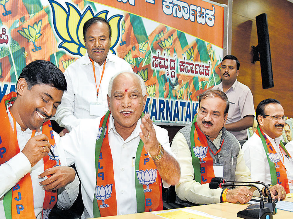 ಬೆಂಗಳೂರು : ಇಂದು ಸಂಜೆ 5.00 ಗಂಟೆಗೆ ರಾಜ್ಯಭವನಕ್ಕೆ ತೆರಳರಿರುವ ಬಿಜೆಪಿ ರಾಜ್ಯಧ್ಯಕ್ಷ ಬಿ.ಎಸ್. ಯಡಿಯ್ಯೂರಪ್ಪ ಮತ್ತು ಅನಂತಕುಮಾರ್ ರಾಜ್ಯಪಾಲರನ್ನು ಭೇಟಿ ಮಾಡಿ ಸರಕಾರ ರಚನೆಗೆ ಹಕ್ಕು ಮಂಡನೆ ಮಾಡಲಿದ್ದಾರೆ.